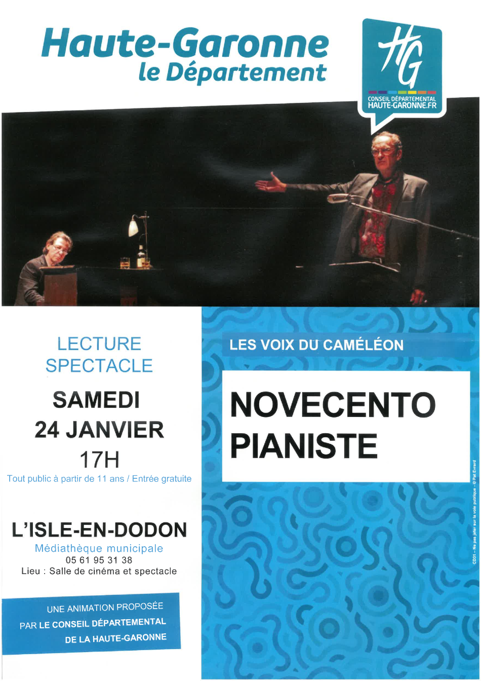 Après avoir été joué au festival off d'Avignon et dans toute la France, ce spectacle fait halte à L'Isle-en-Dodon grâce au partenariat avec la médiathèque départementale. Né lors d'une traversée, Novecento, à 30 ans et n'a jamais mis le pied à terre. Naviguant sans répit sur l'Atlantique, il passe sa vie les mains posées sur les 88 touches noires et blanches d'un piano, à composer une musique étrange et magnifique, qui n'appartient qu'à lui : la musique de l'Océan dont l'écho se répand dans tous les ports.