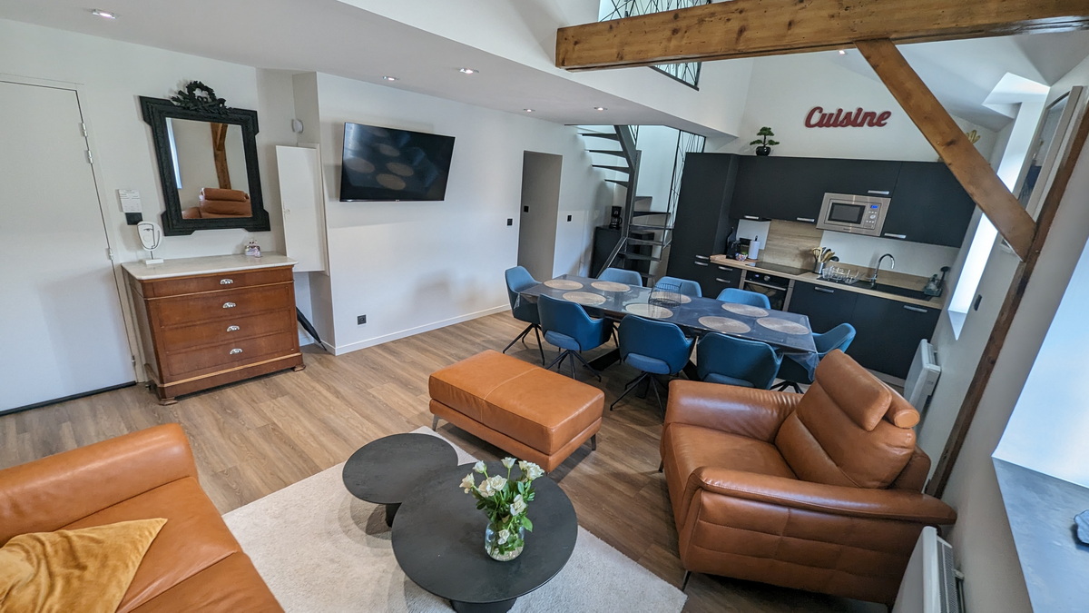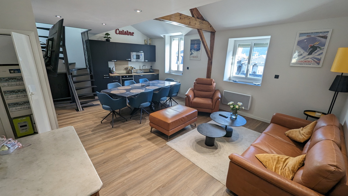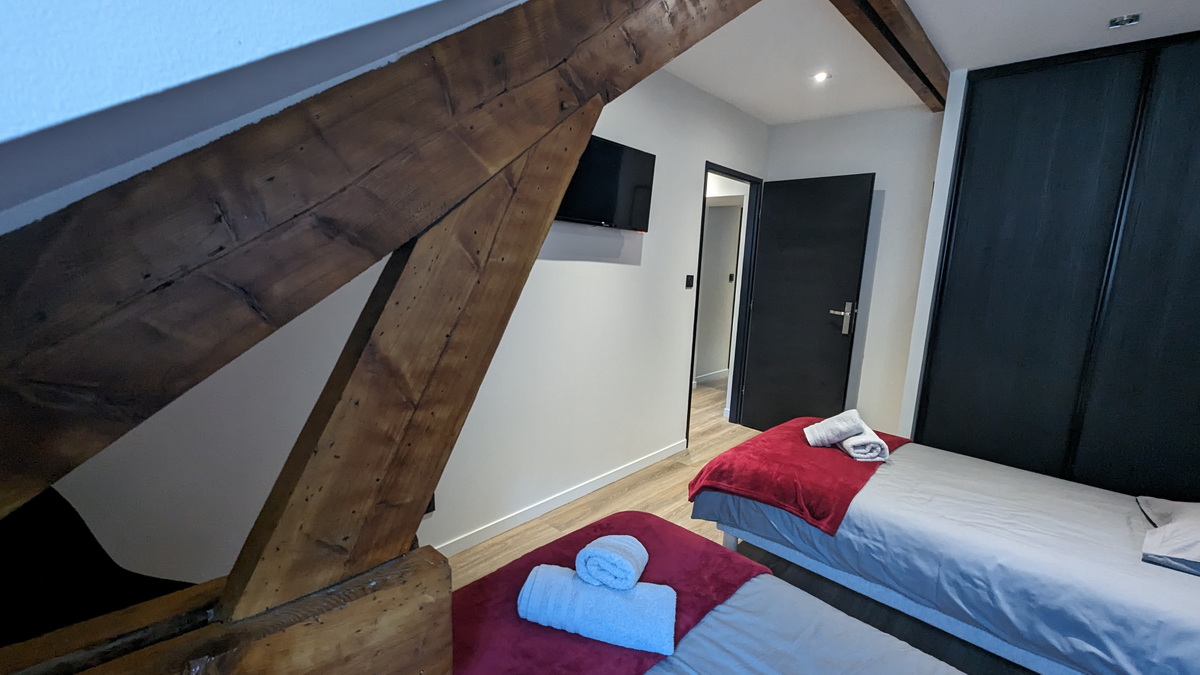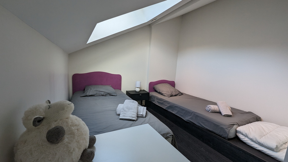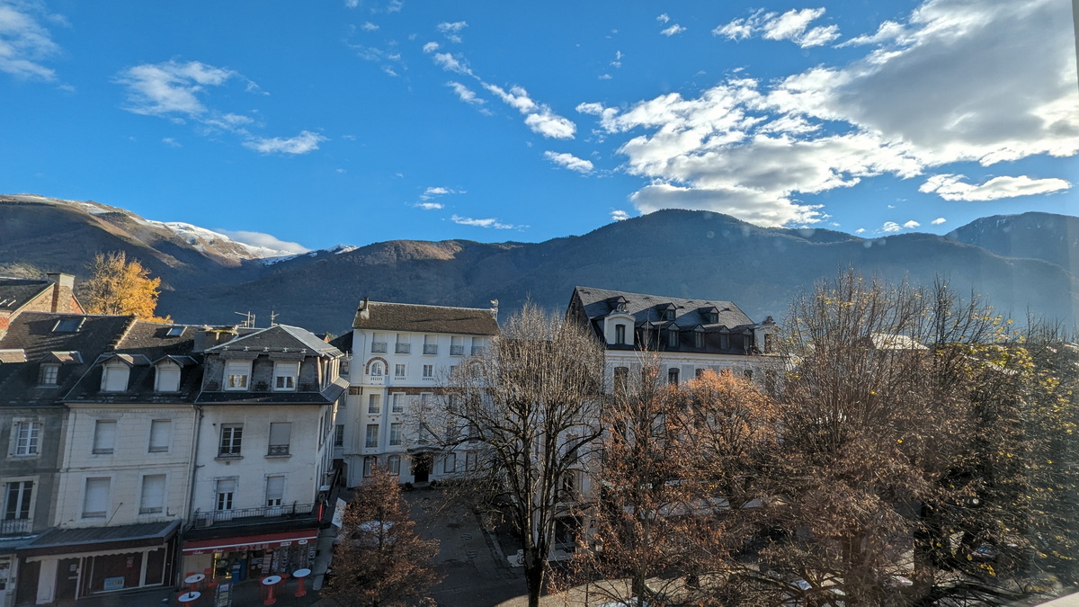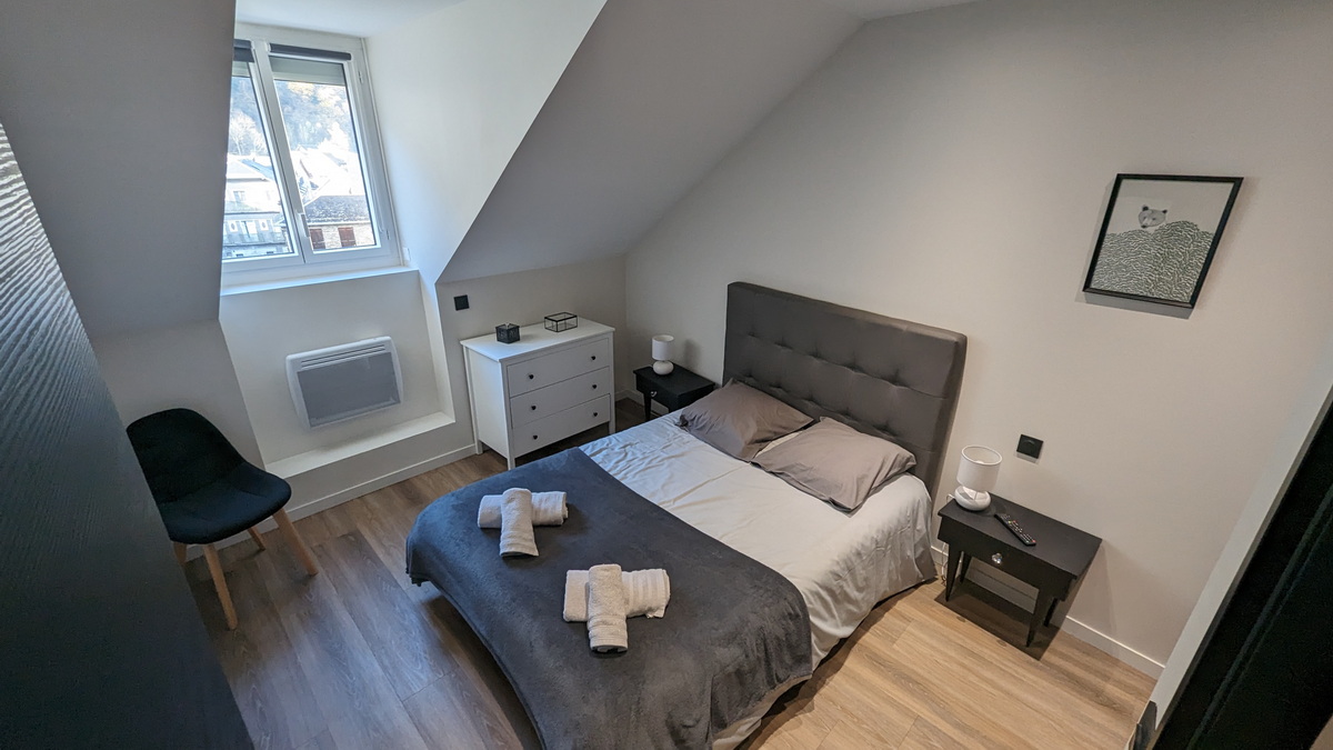 Our flat 3 is a spacious 85 m² T5 duplex apartment on the third floor with lift, in the heart of Bagnères-de-Luchon. As soon as you enter, a spacious living room welcomes you, with its fitted kitchen at the back of the room. The balcony offers a pleasant view over the Allée d'Étigny, the town's lively main thoroughfare. In the hallway, you'll find a bathroom with shower and separate toilet. The flat has 3 bedrooms plus an additional sleeping area: - The first bedroom with a 140 cm double bed - The second bedroom with two 90 cm single beds - The third bedroom on the first floor has a 160 cm double bed and a private bathroom. - A sleeping area at the end of the first floor with two 90 cm beds All the bedrooms offer uninterrupted views of the mountains and the Superbagnères winter sports resort. A major bonus: the new cable car (due to open in December 2023) that takes you directly to the resort is just a 2-minute walk from the flat.