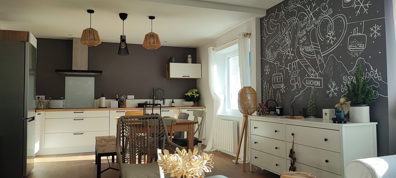 Warm, spacious and comfortable, with breathtaking views of the Venasque. Ideally located for a holiday or weekend with family or friends. Located in the heart of Luchon, guests can reach the Avenue d'Etigny in 3 minutes and the Lac de Badech and its cycle path in 5 minutes. Two supermarkets are nearby. The attic is arranged as follows: one bedroom with 1 double bed and 1 bunk bed, two double/attic bedrooms with 1 pull-out bed, 1 double and 2 single beds. All bedrooms have storage space. 3 bathrooms with WC. Kitchen with oven, microwave, dishwasher, Nespresso coffee machine, kettle, toaster, raclette machine. A 40 m² lounge with TV, speakers and games. Wifi internet access. South-facing shared area, enclosed garden and 35 m² terrace with large table. Enclosed private parking, motorbike and bike shelter and ski equipment. Barbecue facilities. Everything is provided for families: cot, baby cutlery, high chair, some games, books, sledges (ask if required). Pets not allowed. Linen not provided. Optional: hire of sheets and towels on request, as well as cleaning services. Weekly rental only during the February and March ski holidays.