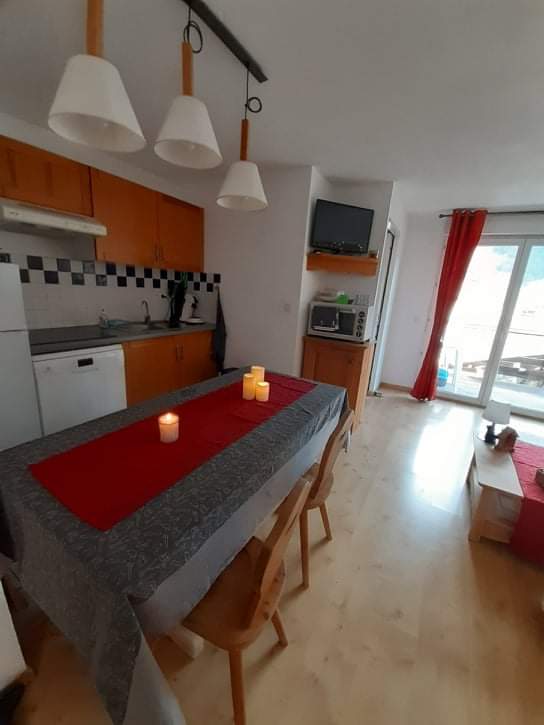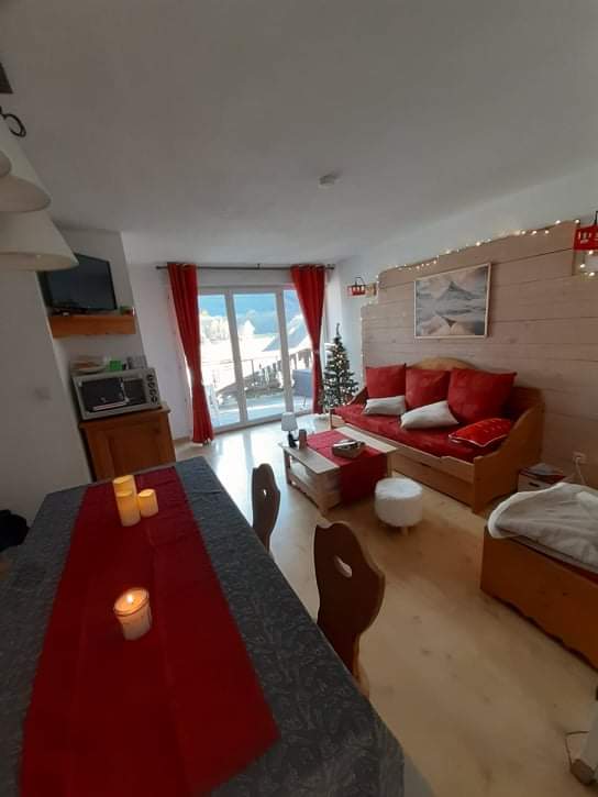 Two bedrooms (1 x 140cm bed and 2 x 80cm bunk beds with duvets). A sofa bed in the lounge. Fully-equipped kitchen, dishwasher, oven, microwave, Senseo coffee machine, ski locker, heated swimming pool in the residence (non-smoking). Corner flat overlooking Lac de Badech. Flat facing east/south. View of the airfield and Lake Badech, very sunny and beautiful terrace it is the corner so sun from morning to 18h.
