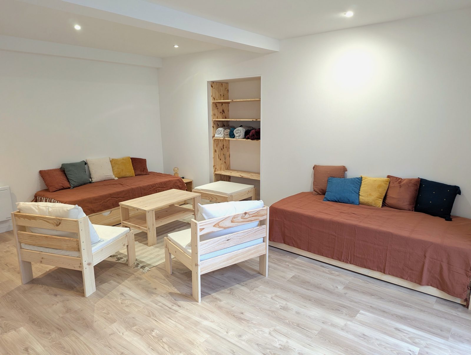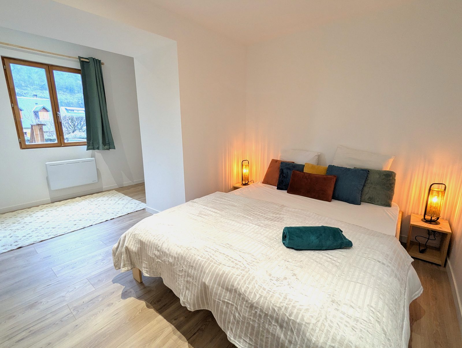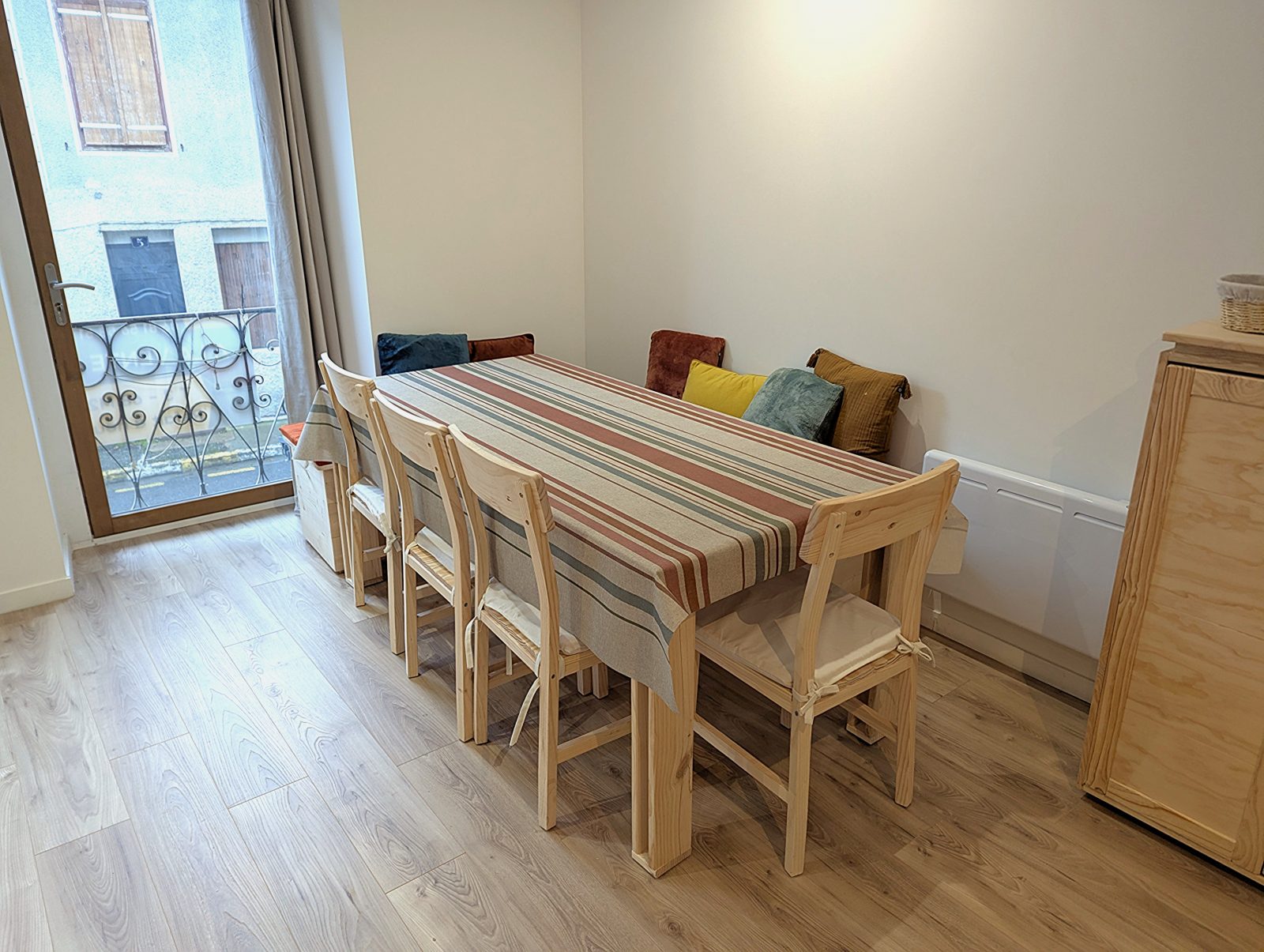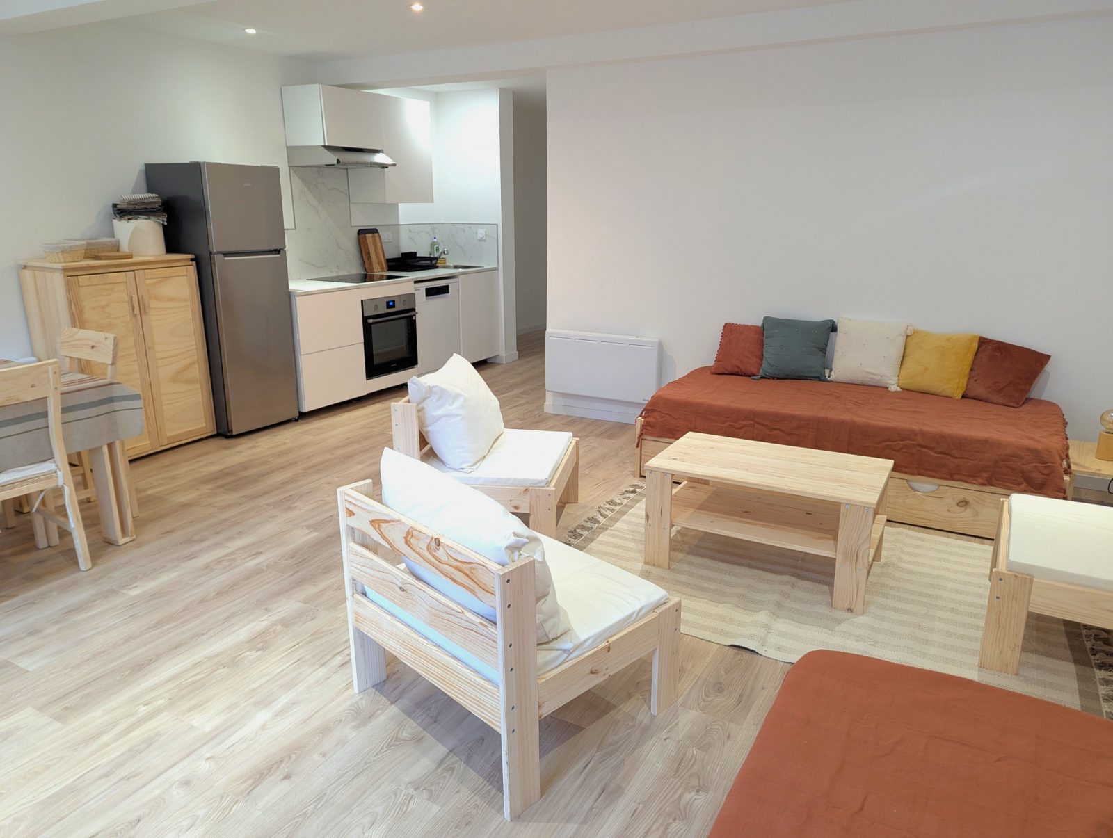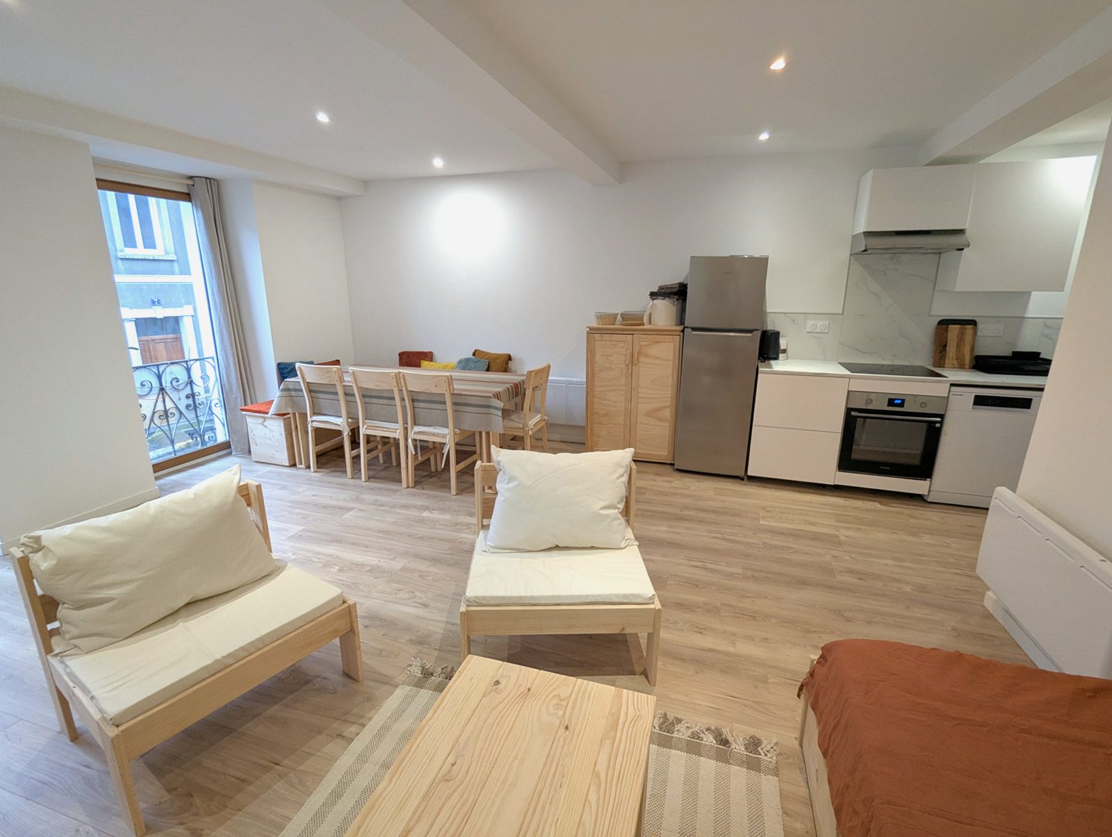 Located on the Place du Marché in the heart of Luchon, this bright, modern flat is perfect for families or groups of friends. Thanks to its large rooms, it can accommodate up to 6 people. It has a spacious living room with two pull-out beds and two comfortable double bedrooms designed to offer peace and quiet after a busy day. The open-plan, fully-equipped kitchen blends harmoniously into the living space, allowing you to share convivial moments over fine meals. The lounge invites you to relax in a cosy atmosphere, with a wide selection of board games. The flat is ideally located, just a stone's throw from the shops, restaurants and entertainment in the town centre. A public car park is just 50 metres away on foot, making access and parking easy.
