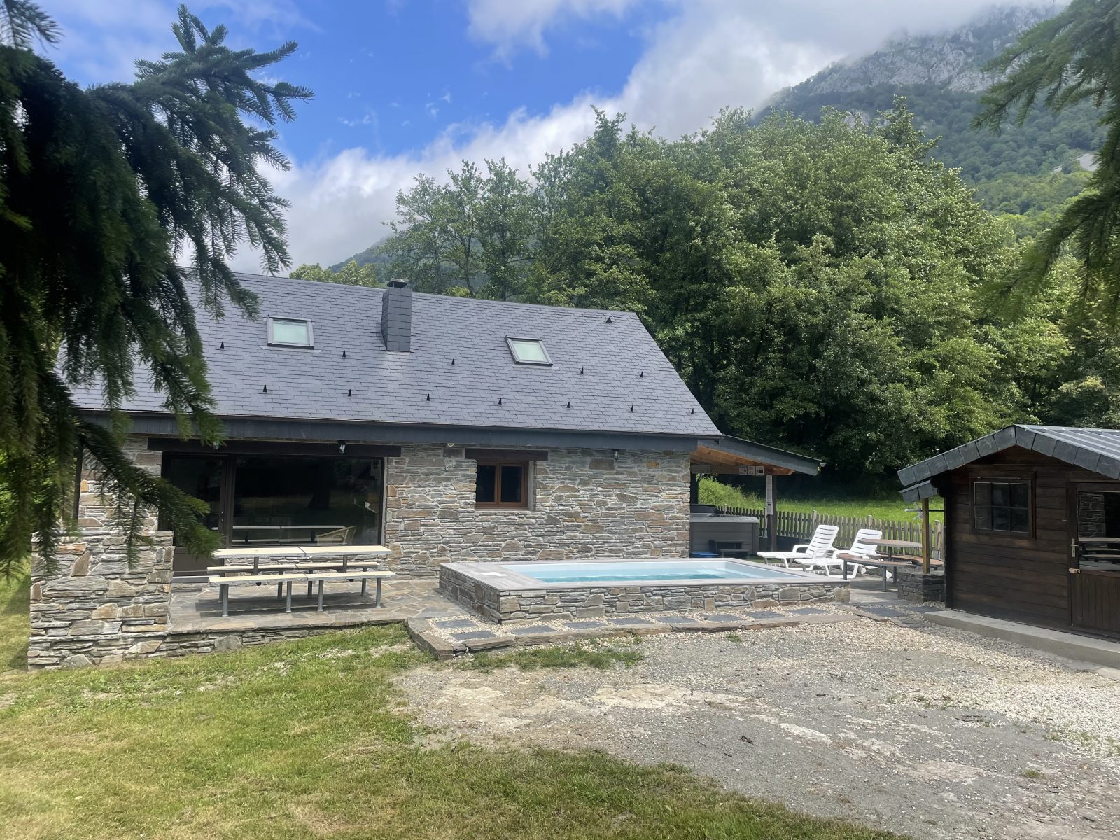 Chalet featuring a top-of-the-range 6-seater spa (guaranteed massage and well-being). Ground floor: A large living-dining room where you can gather around a large convivial family table with the warmth of a fireplace with a panoramic view of the mountains. A living room with a sofa bed. (2 extra beds). Separate fitted kitchen. Bathroom with shower and WC. A bedroom with wardrobe, comprising a 160cm bed for 2 people (sleeps 2). First floor: A bathroom with shower and WC. 3 attic bedrooms including a dormitory. One bedroom with a double bed (140cm) for 2 people and storage space (sleeps 2) + 1 cot. One bedroom with a double bed (140cm) for 2 people and 1 single bed (90cm) and storage space (sleeps 3). A dormitory with 2 single beds (sleeps 2) and a bunk bed with drawer (sleeps 2). At your disposal, free of charge, throughout your stay: Barbecue, washing machine, tumble dryer, clothes line, baby equipment (plastic bathtub, booster seat, high chair, cot), raclette, fondue set, coffee maker, kettle, toaster, dishwasher, fridge-freezer, board games. Private parking for your vehicles. Large wooded park, 2 large terraces, garden furniture and barbecue are all available for you to relax in this peaceful natural setting. Your holidays with family and friends will be unforgettable and relaxing. You can discover the mountains in all seasons. Nature lovers are sure to fall in love! You'll be just 5m (by car) from all amenities. Animals, our small to medium-sized friends, depending on the period of the stay booked (dogs, cats) are accepted with great pleasure on condition that the rented property is returned impeccably clean (hair, paw prints, smell of urine, excrement). Spa available outside the summer season. Possibility of heated swimming pool (Option 89 €) Depending on the outside climate and the installation of the cover at night, to have a pool temperature of approximately 25° with an outside temperature of 23° to 28°.