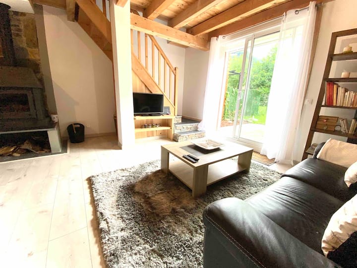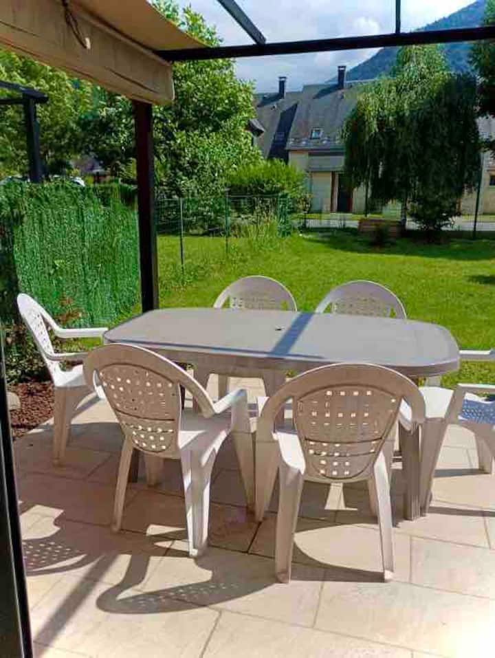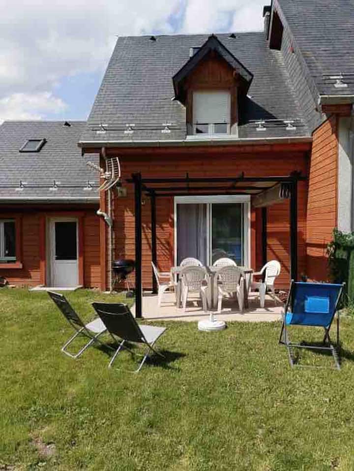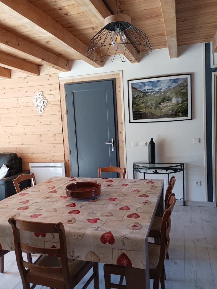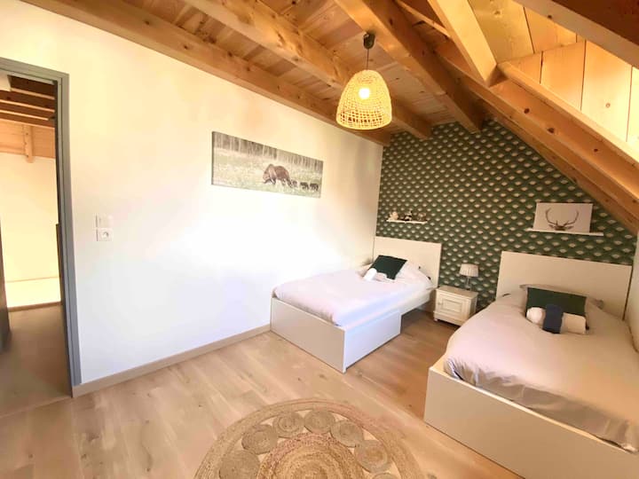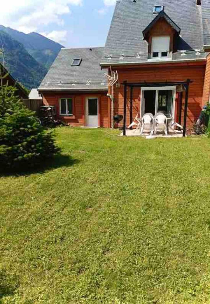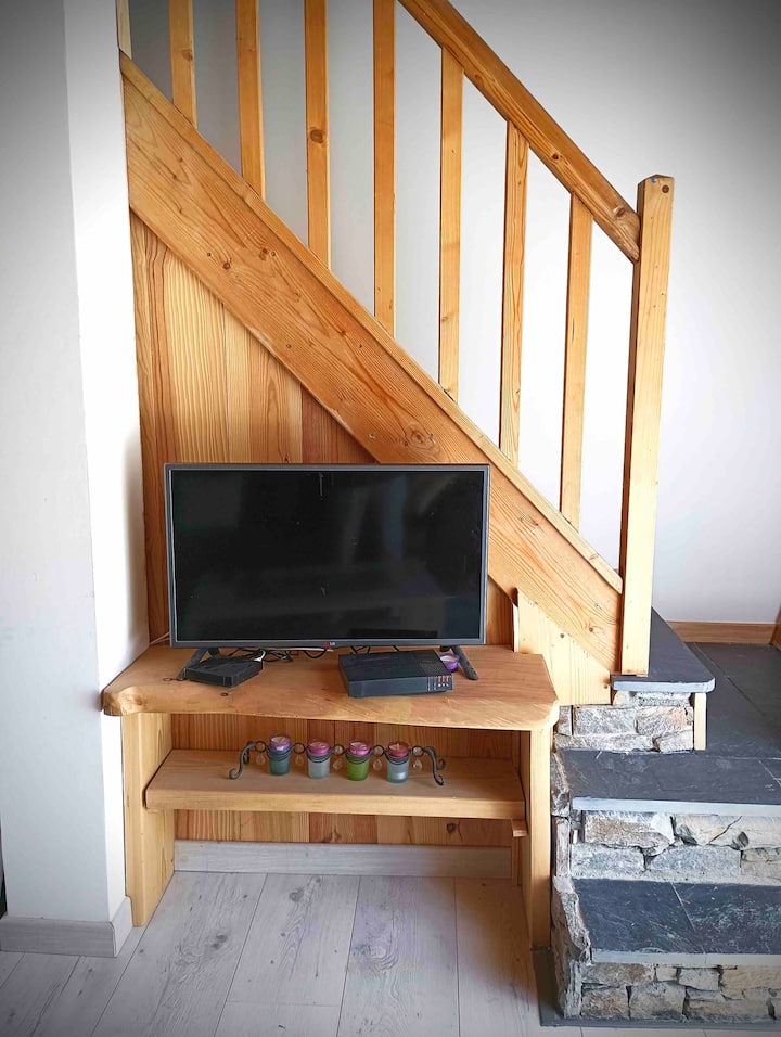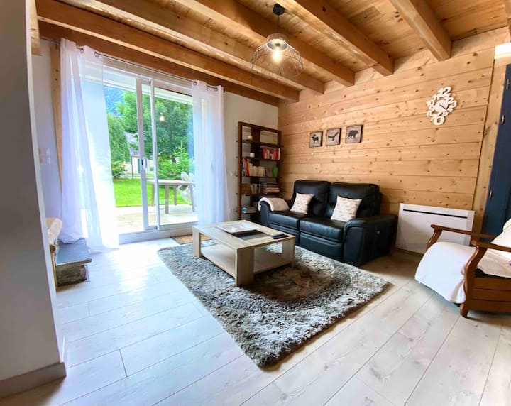 Very recently built, this south-facing chalet has a terrace, garden and mountain views. Ground floor: living room, sitting room, kitchen with dishwasher. Wood-burning stove. A shower room with WC. Upstairs there is a bedroom with 1 double bed (160cm). A bedroom with 2 single beds. A bathroom with WC and washing machine. On the 2nd floor, there is a converted attic space with 2 single beds (90cm), accessed by a ladder-style staircase. Private car park. Bed linen and cleaning optional. Terrace, garden with garden furniture, sun loungers and barbecue.