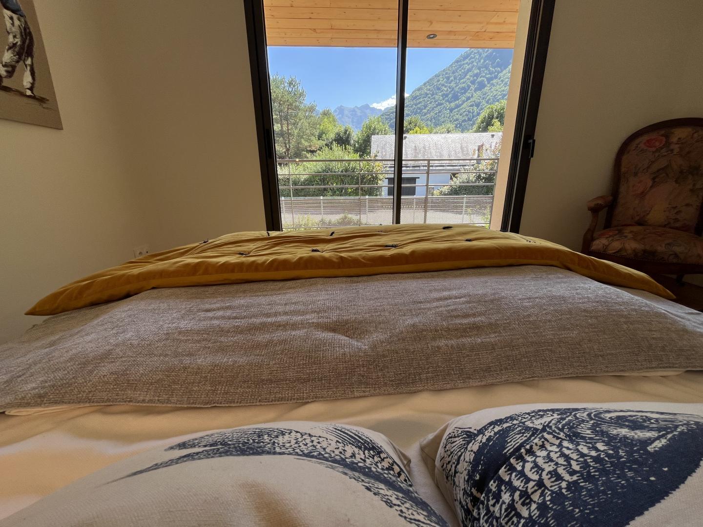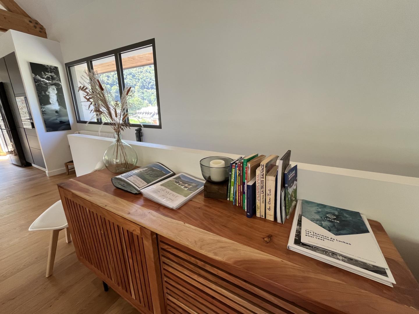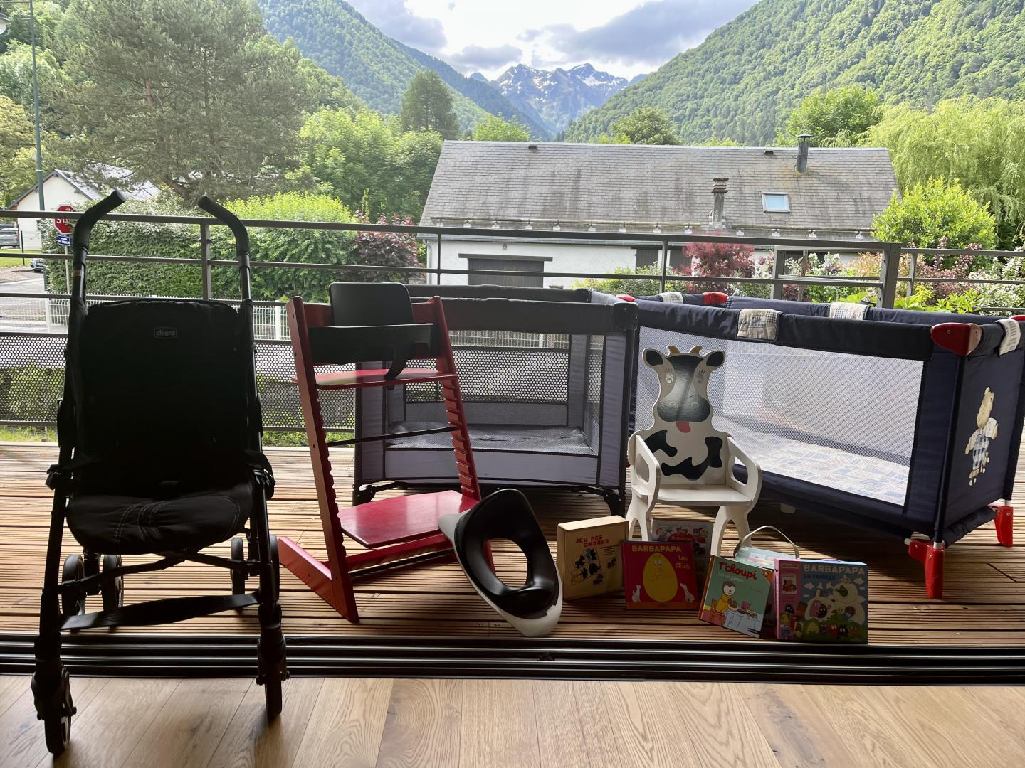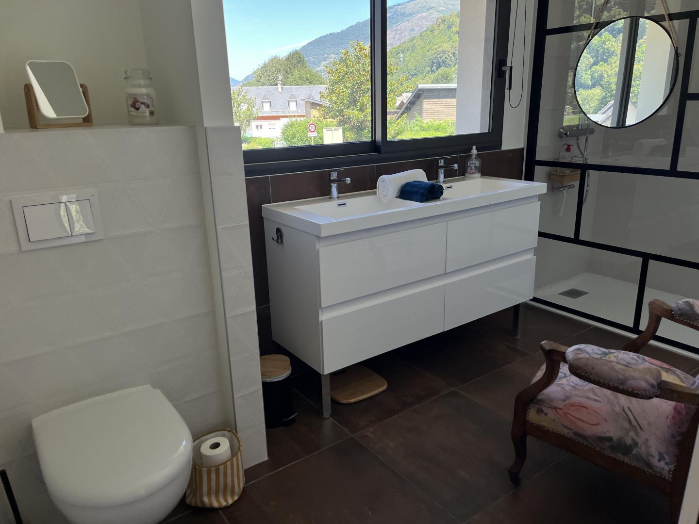 Just 1km from the centre of Bagnères-de-Luchon, Chalet Manica is ideal for welcoming family or friends to the mountains in summer or winter. In addition to the leisure activities on offer in the mountains: hiking from the gîte (Cascade de Sidonie), skiing (express rack railway to Superbagnères 1.9km away), fishing in La Pique, etc., the resort of Luchon, with its shops, services and entertainment, is within easy reach: thermal baths and aqualudic centre 1km away, golf course 2.2km away, Badech lake (swimming) 4.3km away, equestrian centre 5.3km away, etc. The Pyrénées Hô adventure park is 20km away (tree climbing, rock climbing...) and Spain is 8km away via the Col du Portillon. So you can make the most of your weekends and holidays! The gîte is set in a contemporary villa facing south towards the peaks, in a quiet, residential area. The 700m² exterior features a grassed garden planted with fruit trees, a courtyard and a covered carport. The house has been designed to maximise light and views of the Pyrenees from every room, and to provide easy access to the garden and upstairs terrace via large picture windows. - Ground floor: the sleeping area of the house comprises an entrance hall (cupboard/wardrobe), a utility room with washing machine/dryer, shoe storage, etc., 3 bedrooms opening onto the garden (1 double bed 140x190cm) (1 double bed 140x190cm) (2 bunk beds, each with 2 single beds 90x200cm), a shower room and a separate toilet. - Upstairs: a straight staircase leads to the large, spacious living room (exposed beams). A central fireplace opens onto the open-plan kitchen and dining area on one side and the lounge on the other. Bedroom (1 double bed 160x200cm), dressing room, shower room, separate WC. - A spiral staircase leads up to the mezzanine, which has been converted into a television room. Gas central heating. No smoking. Pets not allowed.