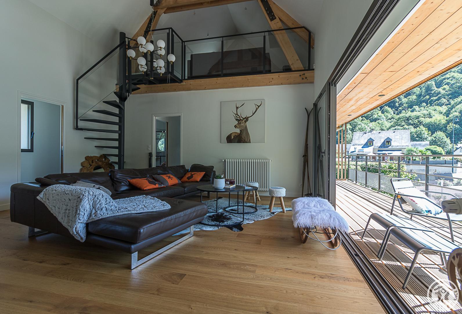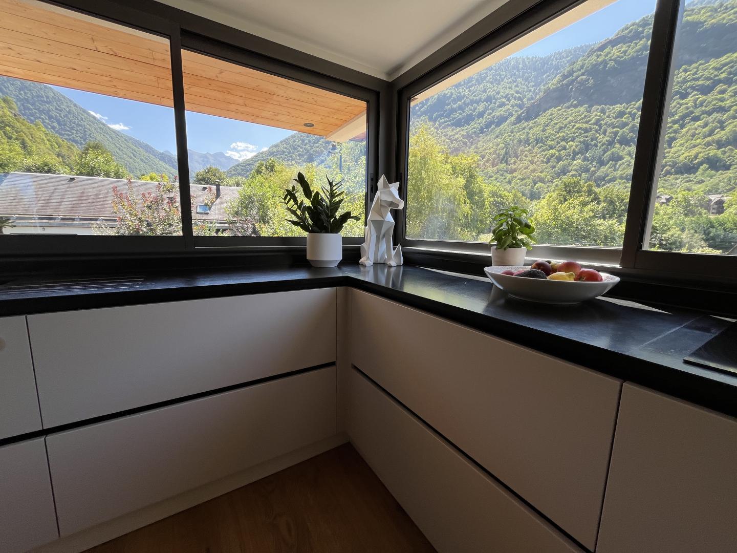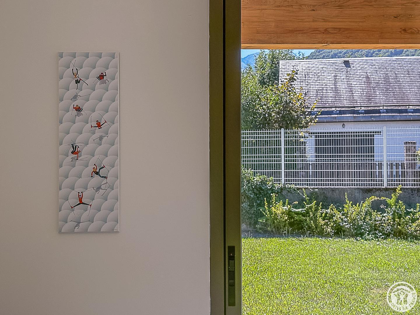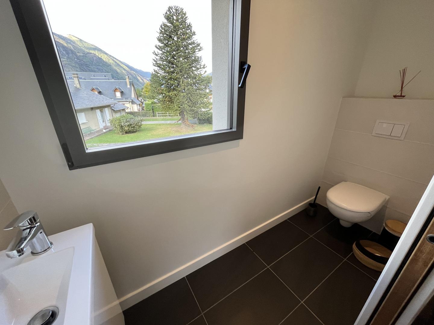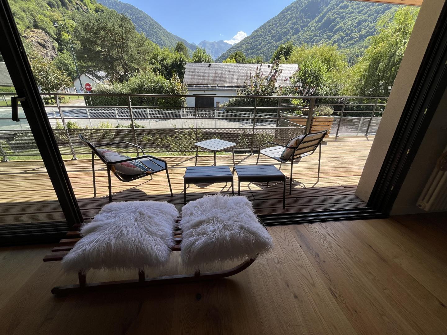 Just 1km from the centre of Bagnères-de-Luchon, Chalet Manica is ideal for welcoming family or friends to the mountains in summer or winter. In addition to the leisure activities on offer in the mountains: hiking from the gîte (Cascade de Sidonie), skiing (express rack railway to Superbagnères 1.9km away), fishing in La Pique, etc., the resort of Luchon, with its shops, services and entertainment, is within easy reach: thermal baths and aqualudic centre 1km away, golf course 2.2km away, Badech lake (swimming) 4.3km away, equestrian centre 5.3km away, etc. The Pyrénées Hô adventure park is 20km away (tree climbing, rock climbing...) and Spain is 8km away via the Col du Portillon. So you can make the most of your weekends and holidays! The gîte is set in a contemporary villa facing south towards the peaks, in a quiet, residential area. The 700m² exterior features a grassed garden planted with fruit trees, a courtyard and a covered carport. The house has been designed to maximise light and views of the Pyrenees from every room, and to provide easy access to the garden and upstairs terrace via large picture windows. - Ground floor: the sleeping area of the house comprises an entrance hall (cupboard/wardrobe), a utility room with washing machine/dryer, shoe storage, etc., 3 bedrooms opening onto the garden (1 double bed 140x190cm) (1 double bed 140x190cm) (2 bunk beds, each with 2 single beds 90x200cm), a shower room and a separate toilet. - Upstairs: a straight staircase leads to the large, spacious living room (exposed beams). A central fireplace opens onto the open-plan kitchen and dining area on one side and the lounge on the other. Bedroom (1 double bed 160x200cm), dressing room, shower room, separate WC. - A spiral staircase leads up to the mezzanine, which has been converted into a television room. Gas central heating. No smoking. Pets not allowed.