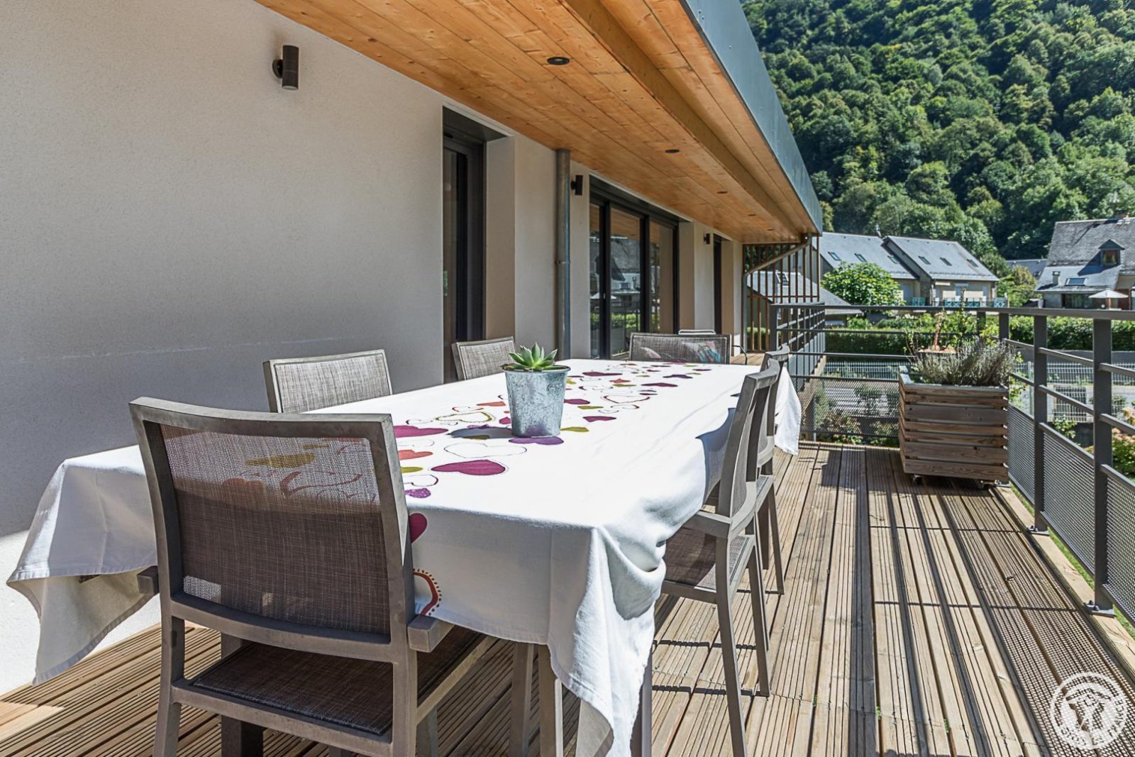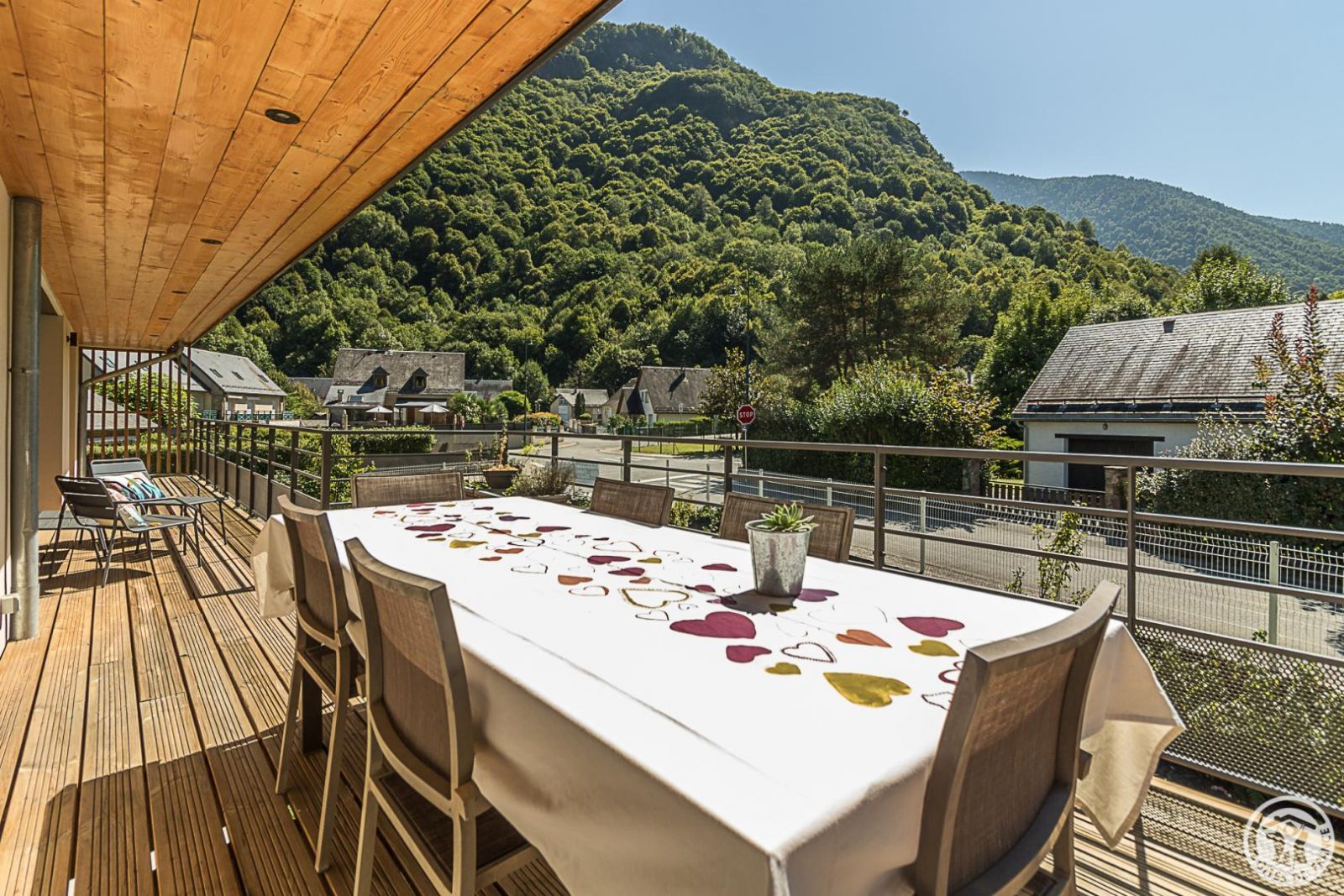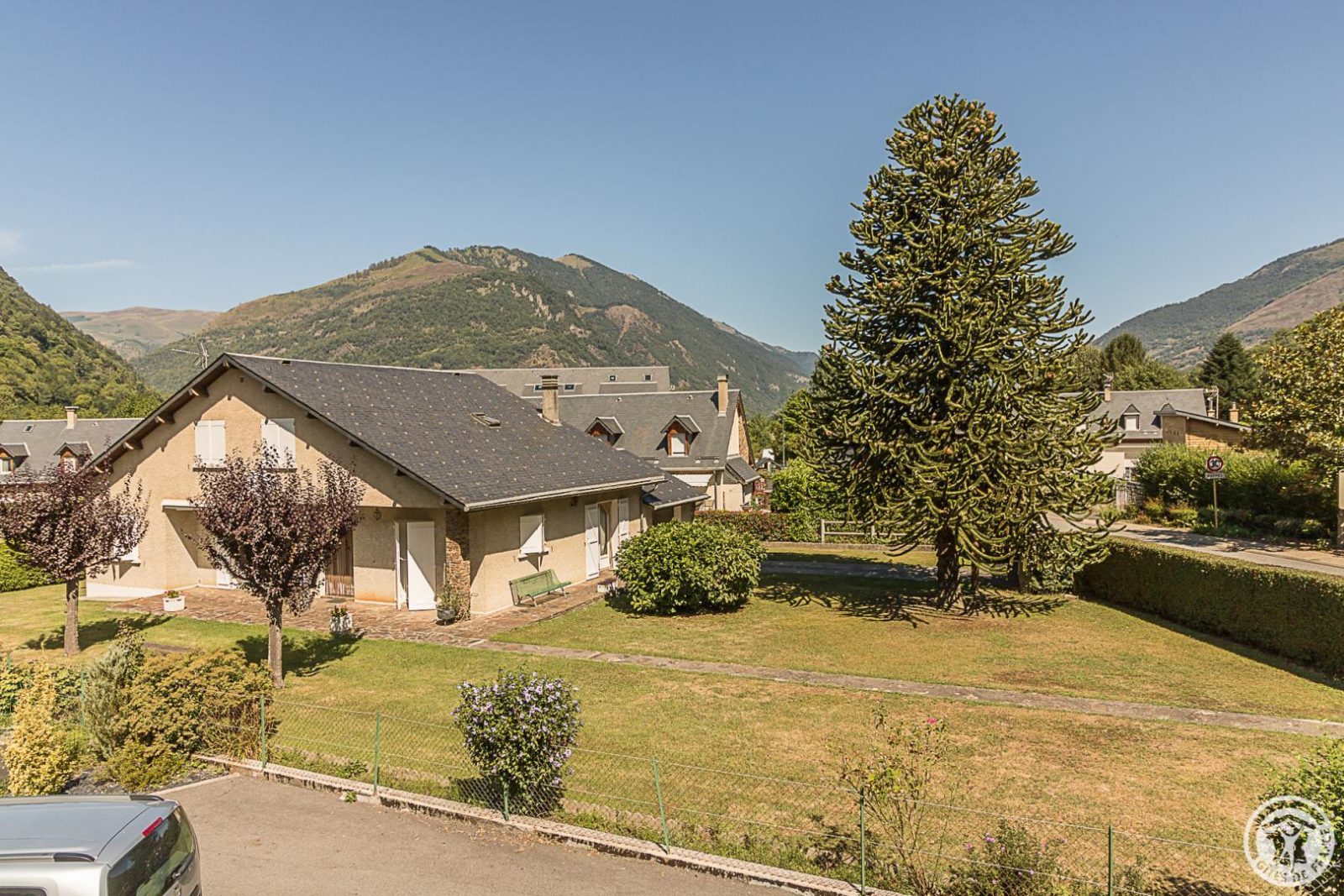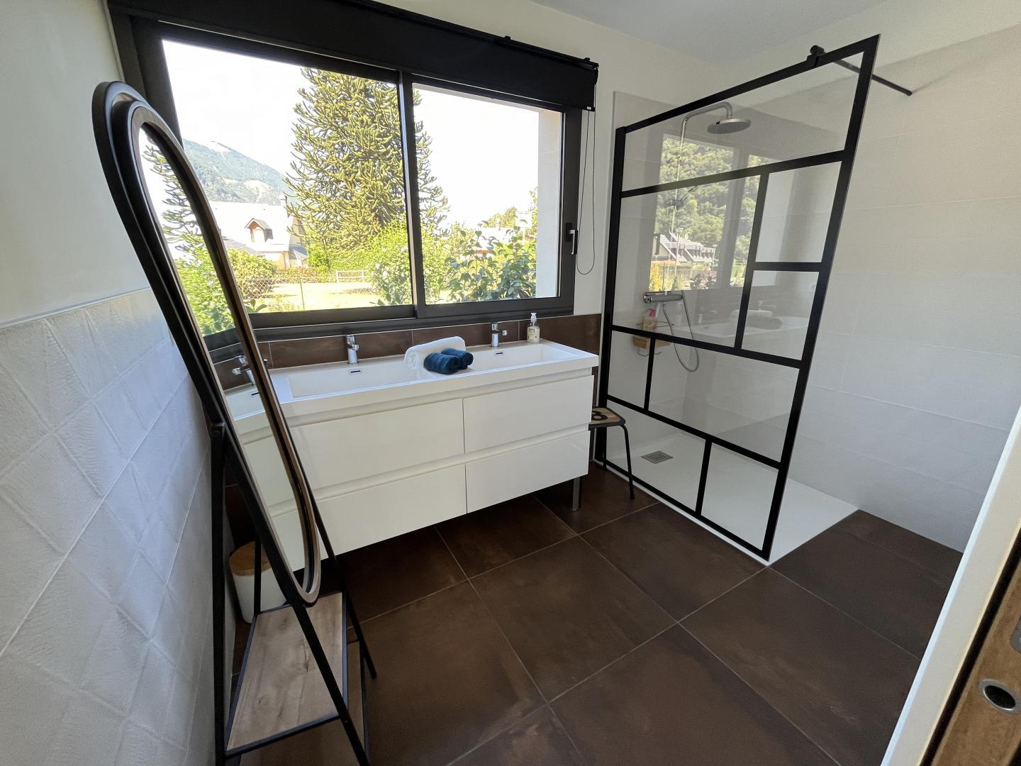 Just 1km from the centre of Bagnères-de-Luchon, Chalet Manica is ideal for welcoming family or friends to the mountains in summer or winter. In addition to the leisure activities on offer in the mountains: hiking from the gîte (Cascade de Sidonie), skiing (express rack railway to Superbagnères 1.9km away), fishing in La Pique, etc., the resort of Luchon, with its shops, services and entertainment, is within easy reach: thermal baths and aqualudic centre 1km away, golf course 2.2km away, Badech lake (swimming) 4.3km away, equestrian centre 5.3km away, etc. The Pyrénées Hô adventure park is 20km away (tree climbing, rock climbing...) and Spain is 8km away via the Col du Portillon. So you can make the most of your weekends and holidays! The gîte is set in a contemporary villa facing south towards the peaks, in a quiet, residential area. The 700m² exterior features a grassed garden planted with fruit trees, a courtyard and a covered carport. The house has been designed to maximise light and views of the Pyrenees from every room, and to provide easy access to the garden and upstairs terrace via large picture windows. - Ground floor: the sleeping area of the house comprises an entrance hall (cupboard/wardrobe), a utility room with washing machine/dryer, shoe storage, etc., 3 bedrooms opening onto the garden (1 double bed 140x190cm) (1 double bed 140x190cm) (2 bunk beds, each with 2 single beds 90x200cm), a shower room and a separate toilet. - Upstairs: a straight staircase leads to the large, spacious living room (exposed beams). A central fireplace opens onto the open-plan kitchen and dining area on one side and the lounge on the other. Bedroom (1 double bed 160x200cm), dressing room, shower room, separate WC. - A spiral staircase leads up to the mezzanine, which has been converted into a television room. Gas central heating. No smoking. Pets not allowed.