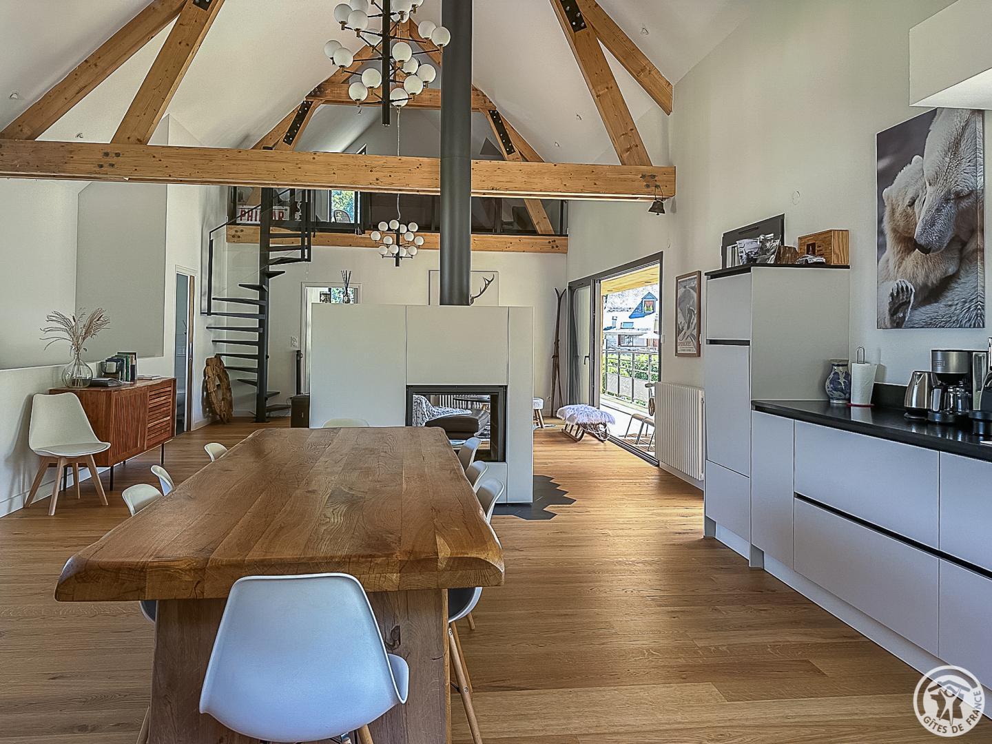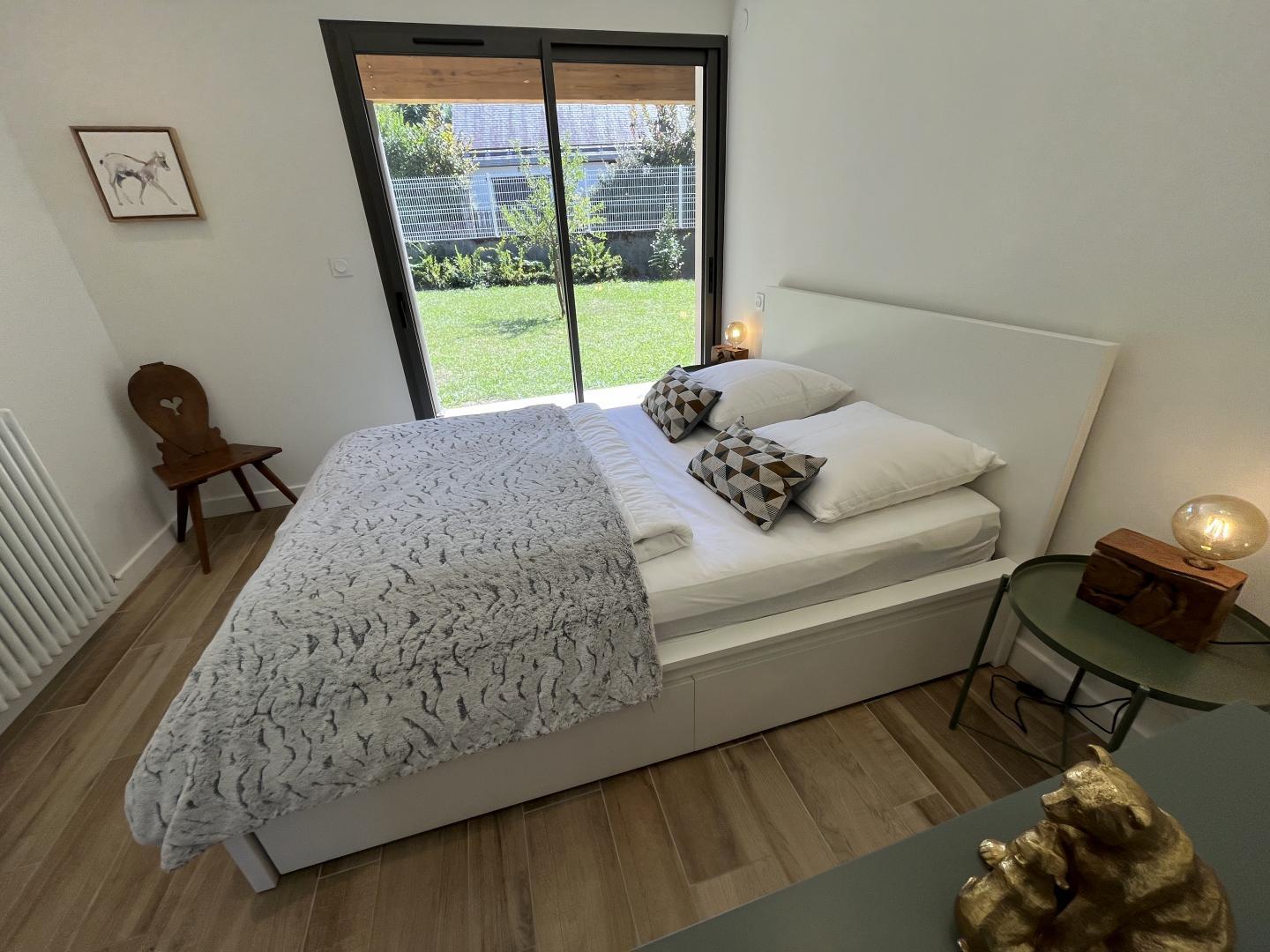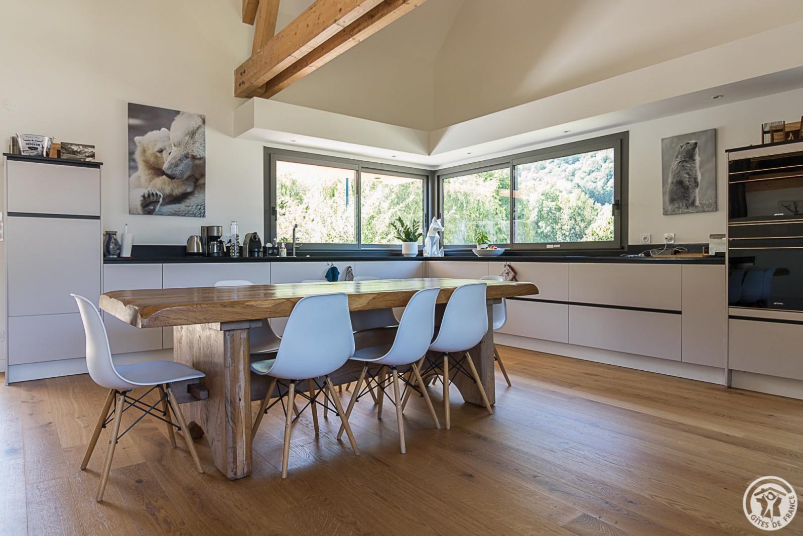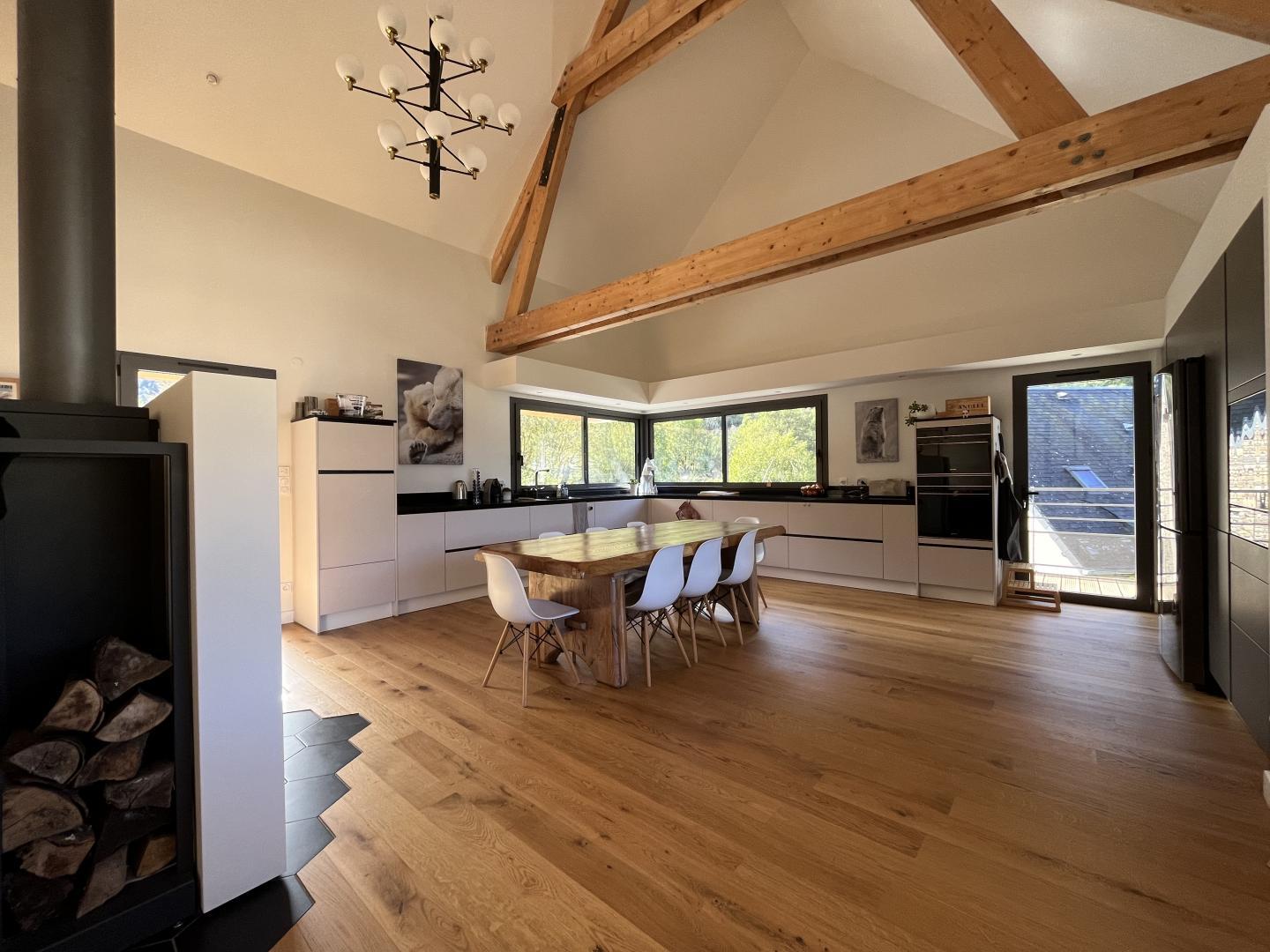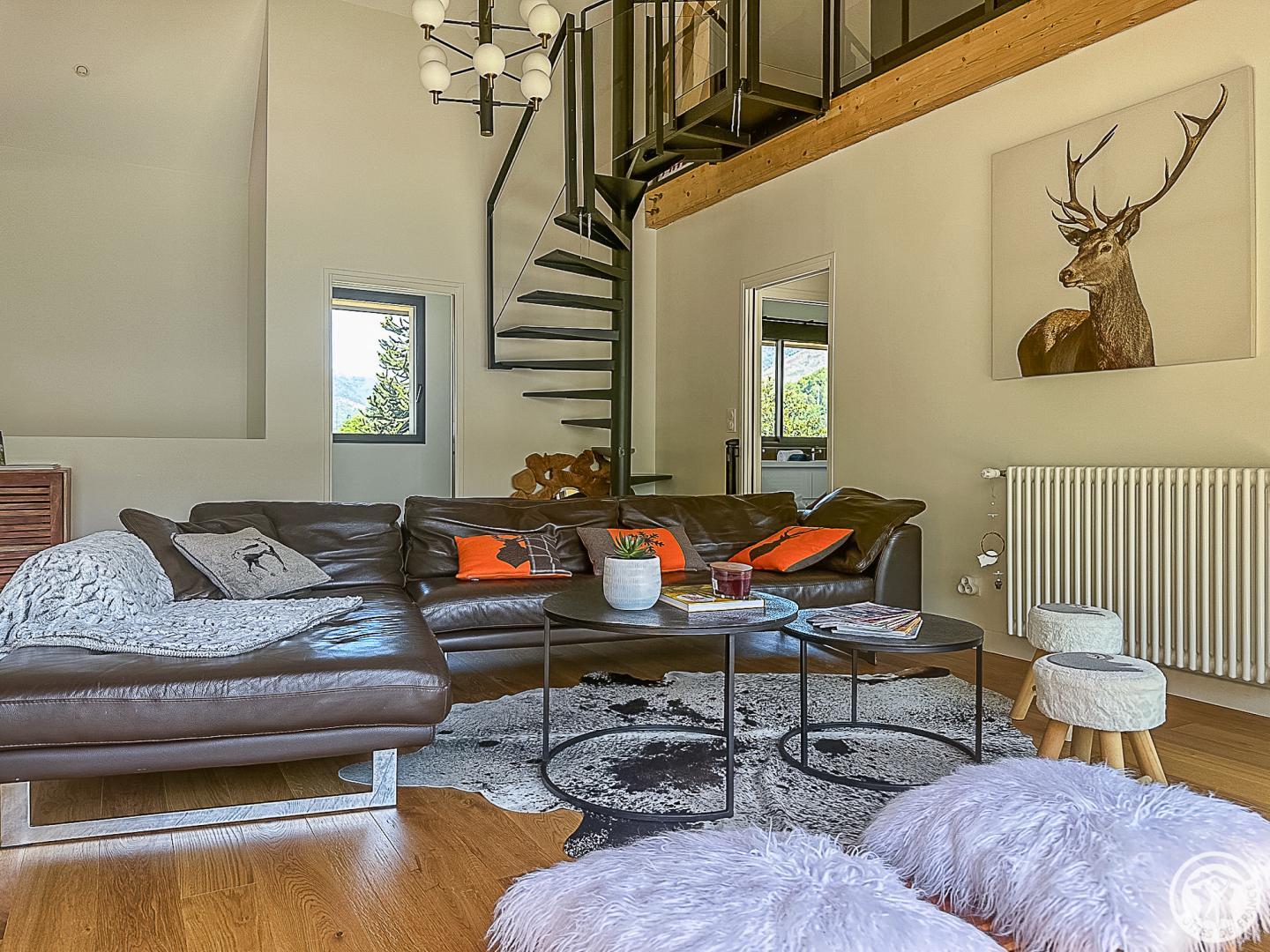 Just 1km from the centre of Bagnères-de-Luchon, Chalet Manica is ideal for welcoming family or friends to the mountains in summer or winter. In addition to the leisure activities on offer in the mountains: hiking from the gîte (Cascade de Sidonie), skiing (express rack railway to Superbagnères 1.9km away), fishing in La Pique, etc., the resort of Luchon, with its shops, services and entertainment, is within easy reach: thermal baths and aqualudic centre 1km away, golf course 2.2km away, Badech lake (swimming) 4.3km away, equestrian centre 5.3km away, etc. The Pyrénées Hô adventure park is 20km away (tree climbing, rock climbing...) and Spain is 8km away via the Col du Portillon. So you can make the most of your weekends and holidays! The gîte is set in a contemporary villa facing south towards the peaks, in a quiet, residential area. The 700m² exterior features a grassed garden planted with fruit trees, a courtyard and a covered carport. The house has been designed to maximise light and views of the Pyrenees from every room, and to provide easy access to the garden and upstairs terrace via large picture windows. - Ground floor: the sleeping area of the house comprises an entrance hall (cupboard/wardrobe), a utility room with washing machine/dryer, shoe storage, etc., 3 bedrooms opening onto the garden (1 double bed 140x190cm) (1 double bed 140x190cm) (2 bunk beds, each with 2 single beds 90x200cm), a shower room and a separate toilet. - Upstairs: a straight staircase leads to the large, spacious living room (exposed beams). A central fireplace opens onto the open-plan kitchen and dining area on one side and the lounge on the other. Bedroom (1 double bed 160x200cm), dressing room, shower room, separate WC. - A spiral staircase leads up to the mezzanine, which has been converted into a television room. Gas central heating. No smoking. Pets not allowed.