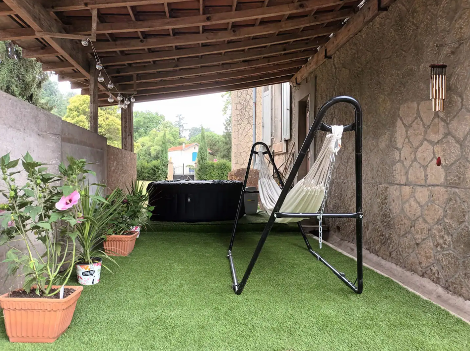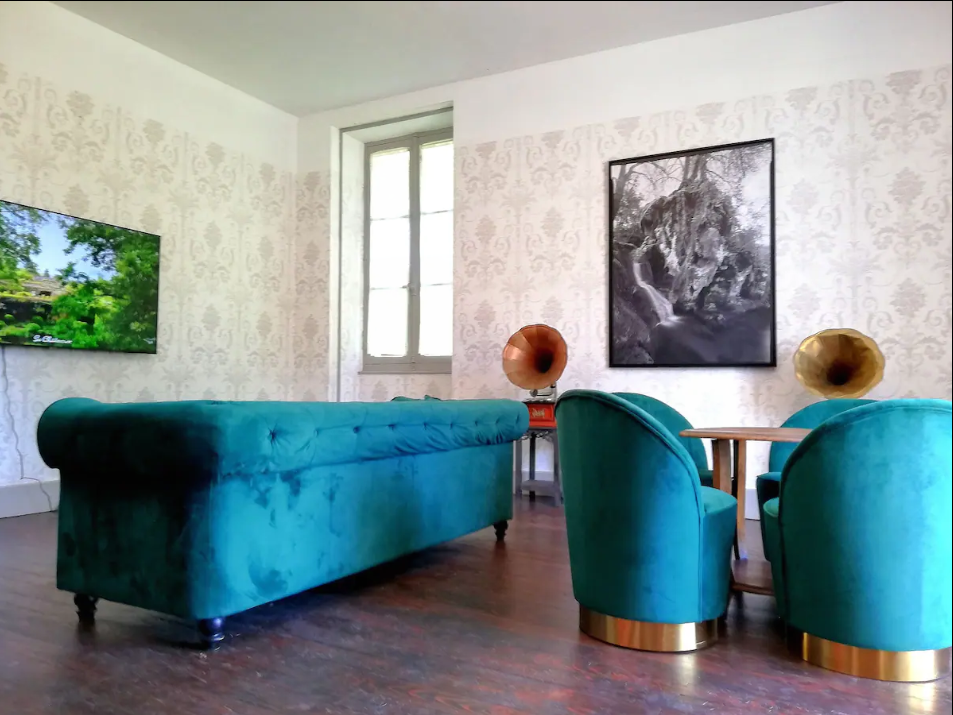 45 minutes south of Toulouse, come and spend some quality time with family and friends at Château l'Argelès. This renovated manor house is built like a small castle with its two towers. You'll enjoy an above-ground swimming pool and inflatable spa during your stay. Just a 5-minute walk from the town centre, you can take advantage of the spa, casino, restaurants, local shops (supermarket, butcher, tobacconist, greengrocer, baker, etc.) and golf course. The accommodation The 340m2 house is entirely private. It comprises 2 lounges, a dining room, a large kitchen, a utility room, 5 bedrooms, 3 shower/bathrooms and 5 WCs. The accommodation comprises on the ground floor - a cosy lounge with 2 red velvet Chesterfield sofas, a fireplace and a library - a relaxation room with a green velvet chesterfield sofa for watching TV (UHD 163cm with Netflix, Disney + and Amazon Prime), 4 matching armchairs and a table for playing board games. -A living/dining/kitchen area with a gas or wood hob, large stainless steel worktops and a dining area with an oval table and 10 chairs. -A utility room with a large fridge, freezer, dishwasher and washing machine. First floor: WC, 4 bedrooms sleeping 10: A family suite with 2 triple bedrooms (one queen-size bed and one single bed per bedroom) and a shower room with shower, washbasin and WC. a double bedroom (queen-size bed) with en suite shower room, washbasin and WC - a large double bedroom (queen-size bed) and its bathroom with bath, shower, double washbasin and WC. -On the second floor, a dormitory with 6 single beds, WC and washbasin. We have a mobile air conditioner for the first floor. Outside there is a large park, two terraces, a gas barbecue, cast aluminium garden furniture, a hammock, a parasol, a 3x6 m reception tent, 16 garden chairs, 4 deckchairs, 3 180cm reception tables, outdoor games (badminton/volleyball), an above-ground swimming pool and a 3-person inflatable spa.