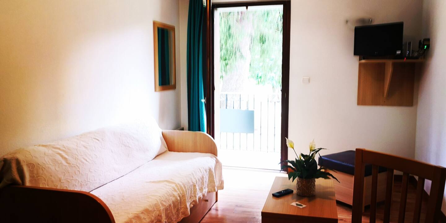Peaceful accommodation less than 5 minutes' walk from the town centre. Cable car, golf, thermal baths, mini-golf, casino park nearby. Pleasant ground floor, free parking, west-facing facing the residence grounds. Enjoy breakfast on the balcony overlooking the mountains, with coffee and tea waiting for you. Ideal for a romantic or family holiday.