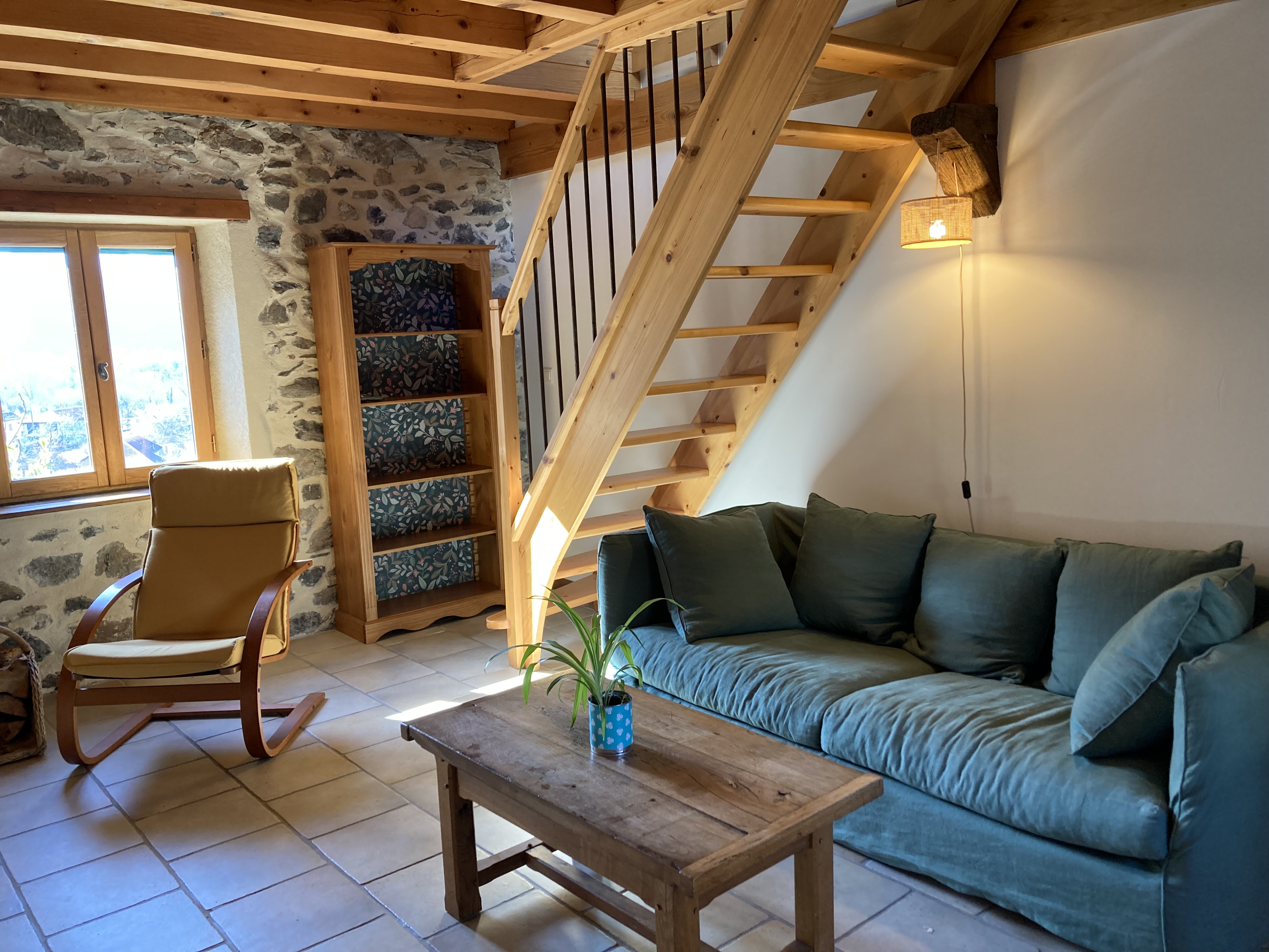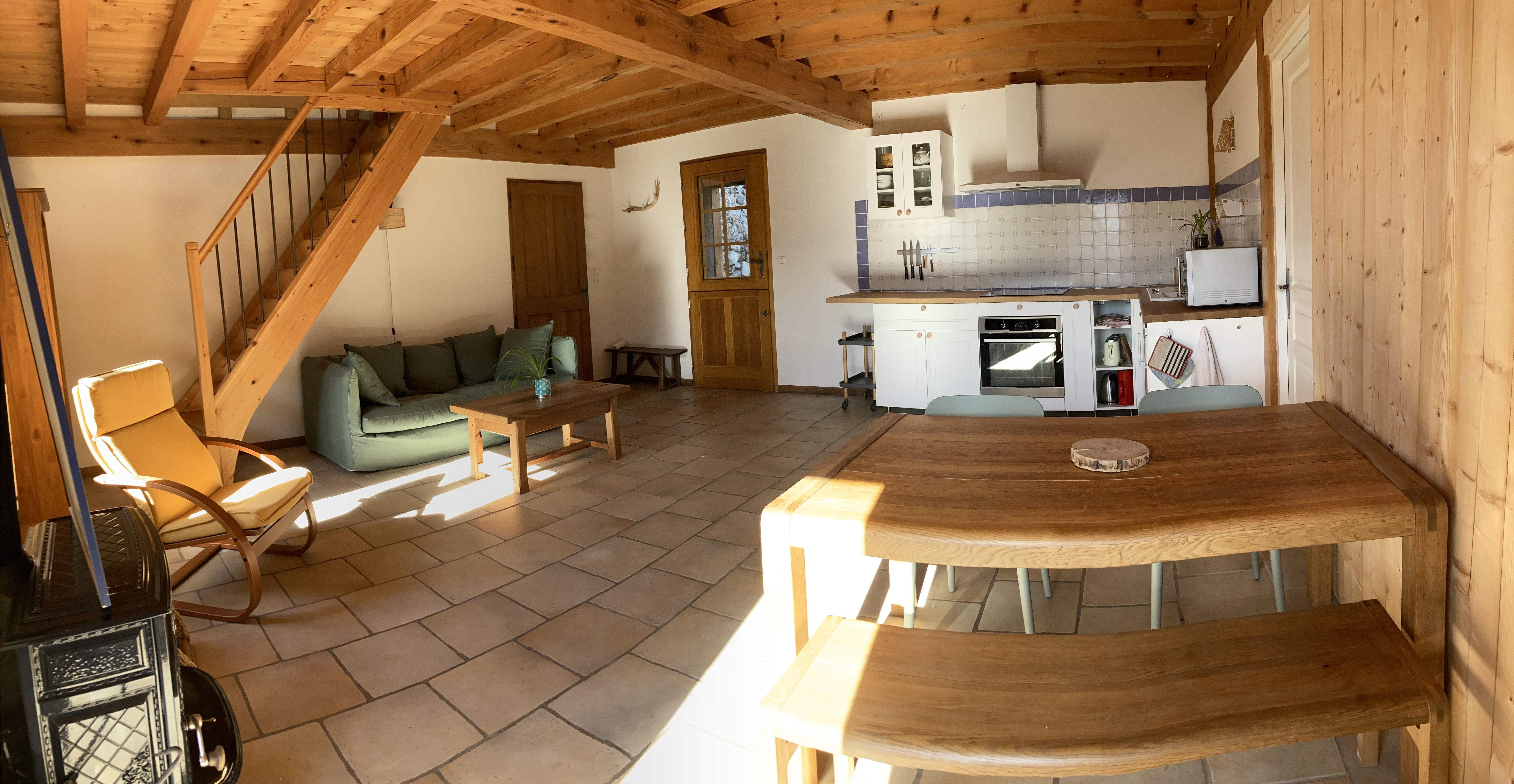 Ground floor living room with fitted kitchen and sitting area. Well-equipped kitchen for cooking great meals! Sitting area with traditional log-burning stove. Bedroom with double bed (140cm). New Tediber bedding, very comfortable! Very quiet, isolated from the road, not a sound to sleep like a baby! All you can hear is the owl and the little birds. Keeps cool thanks to the thick stone walls. Spacious bathroom with walk-in shower and dry toilet. South-facing terrace overlooking fields, cows, horses and the Barousse mountains. Not overlooked. Large room upstairs with free access if available. Yoga mats, body-building and pilates equipment. Ideal if it rains with the children to run around indoors! Not heated.