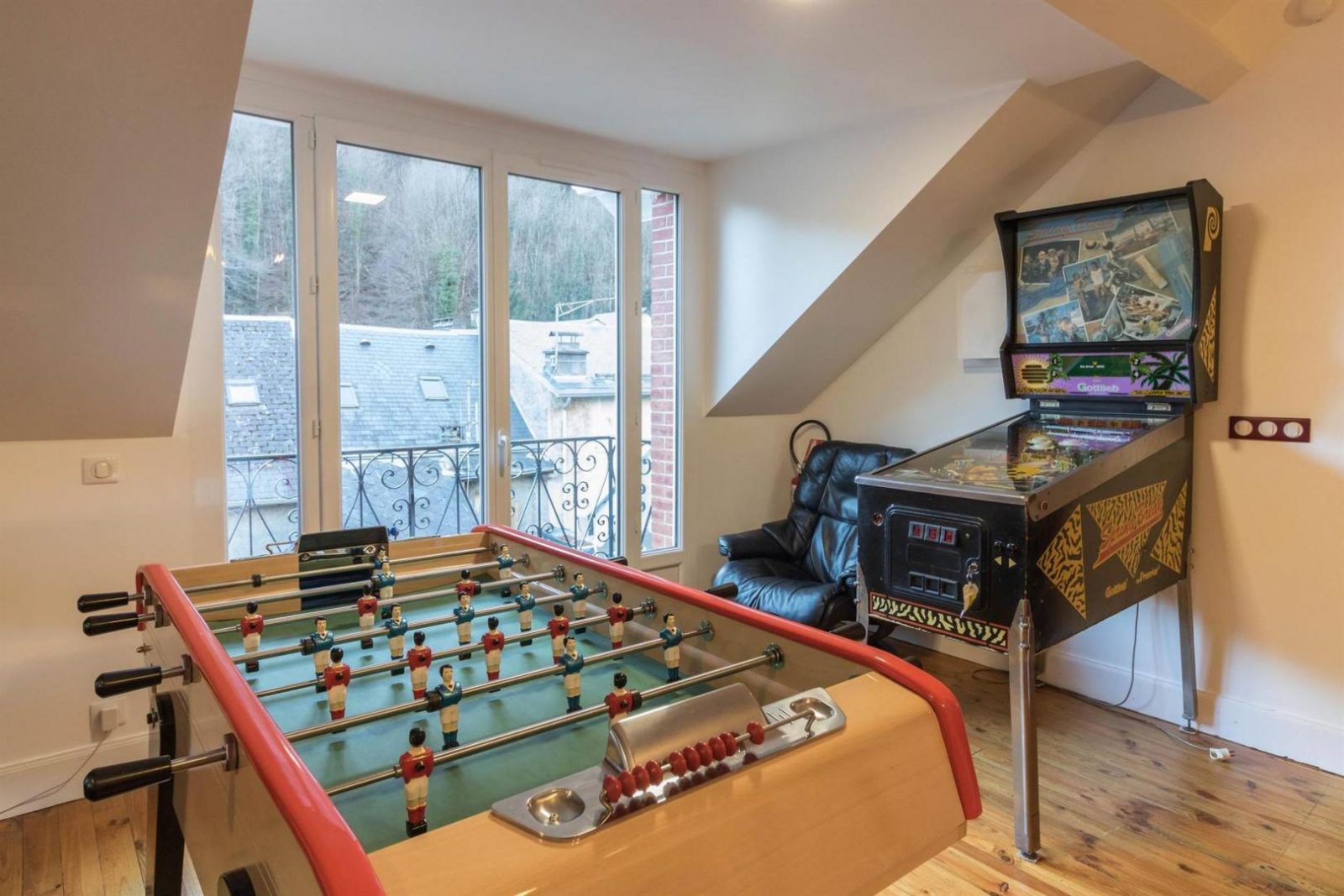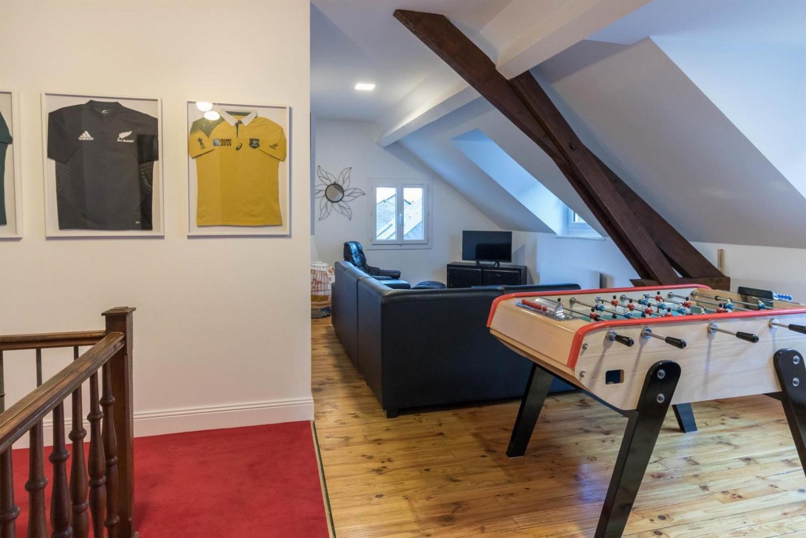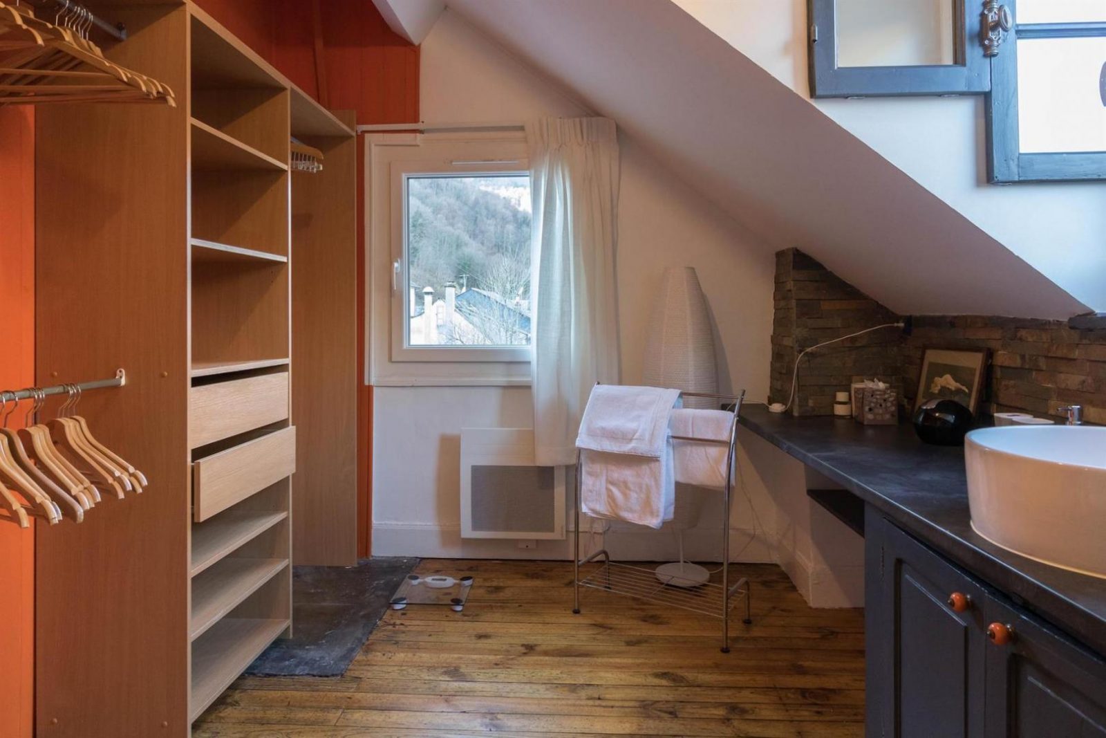 Stunning façade and incredible mountain views from the bedrooms. Beautiful furnishings. Gîte located 1km walk from all shops and services: cable car for the summer and winter resorts of Luchon-Superbagnères. Motorcyclists welcome. Your ideal holiday destination with family or friends, summer or winter! Arranged over 3 levels: 7 bedrooms for 15 people, 4 shower rooms. - Ground floor: entrance into the living room, dining room opening onto the kitchen, utility room, WC. - First floor: study on the landing, 4 bedrooms (2 single beds 90cm twin with balcony) (1 double bed 140cm with private shower room/WC) (2 single beds 80cm twin with balcony) (1 double bed 160cm with private shower room), shared bathroom, WC. - Second floor, under the eaves: mezzanine relaxation/games area with table football and pinball machine, 3 bedrooms (3 x 80cm single beds, 2 of which can be twinned, with en-suite shower room/WC) (1 x 140cm double bed with en-suite bathroom/WC + shower) (1 x 160cm double bed with en-suite shower room/WC). - Air-conditioned wellness area on the ground floor with sauna & fitness room (bike, elliptical and treadmill) reserved entirely for the gîte. - Bike and ski storage. Pleasant enclosed garden, terrace and summer kitchen. Table tennis, covered carport and electric vehicle charging station just a few metres away. TELETRAVAIL: dedicated office space with desk, lamp facilities, nearby power socket for a laptop, extension lead and power strip available. High-speed internet connection (wifi). RJ45 cable in another room. 4G telephone coverage (operator: Orange). Cordless telephone.