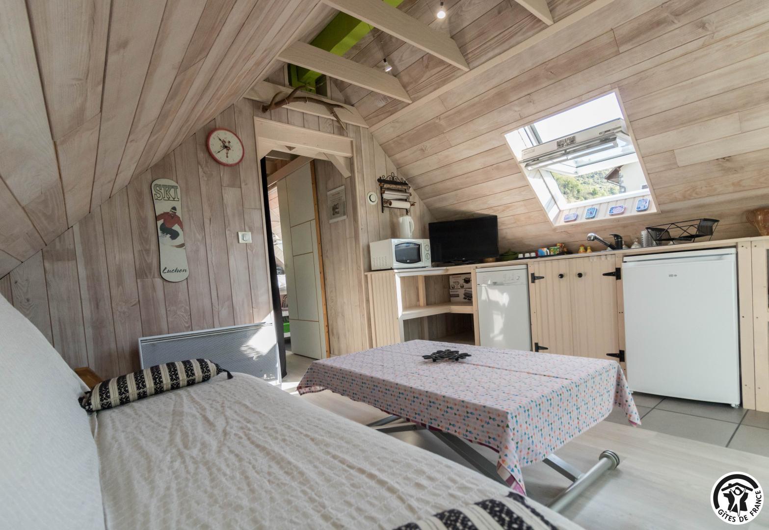 Very well equipped (raclette machine, multifunction grill: croque monsieur, plancha...) and very comfortable, you will be ideally placed for your romantic breaks in the heart of the Pyrenees. Numerous activities nearby: 7km from Bagnères-de-Luchon (a major site in the Occitanie region), Luchon-Superbagnères ski resort and health spa. In summer, the queen of the Pyrenees is an attractive place to hire bikes and ride down the mountains, as well as canyoning, rafting and canoeing! Spain 14km from the gîte, Peyragudes ski resort 9km away, Lac d'Oô hiking trails 7km away, Antignac water sports centre 10km away and the Pyrénées Hô rock-climbing park 24km away. Saint-Bertrand-de-Comminges, one of France's favourite villages, is 39km away. Single-storey studio measuring 16m2, after descending 3 steps: entrance, separate WC, shower room with shower and washbasin, sleeping area with 1 double bed (140x190cm) (flat-screen TV), living room with fully-equipped kitchen (2 fridges, one with freezer compartment, Senseo coffee maker and traditional coffee maker, gas cooker with 4 rings and oven, microwave), convertible sofa for 2 people (140x190cm) (and flat-screen TV), lift-up coffee table suitable for meals. Wifi internet access. Private parking space for one car 10 metres from the gîte. Garden furniture.