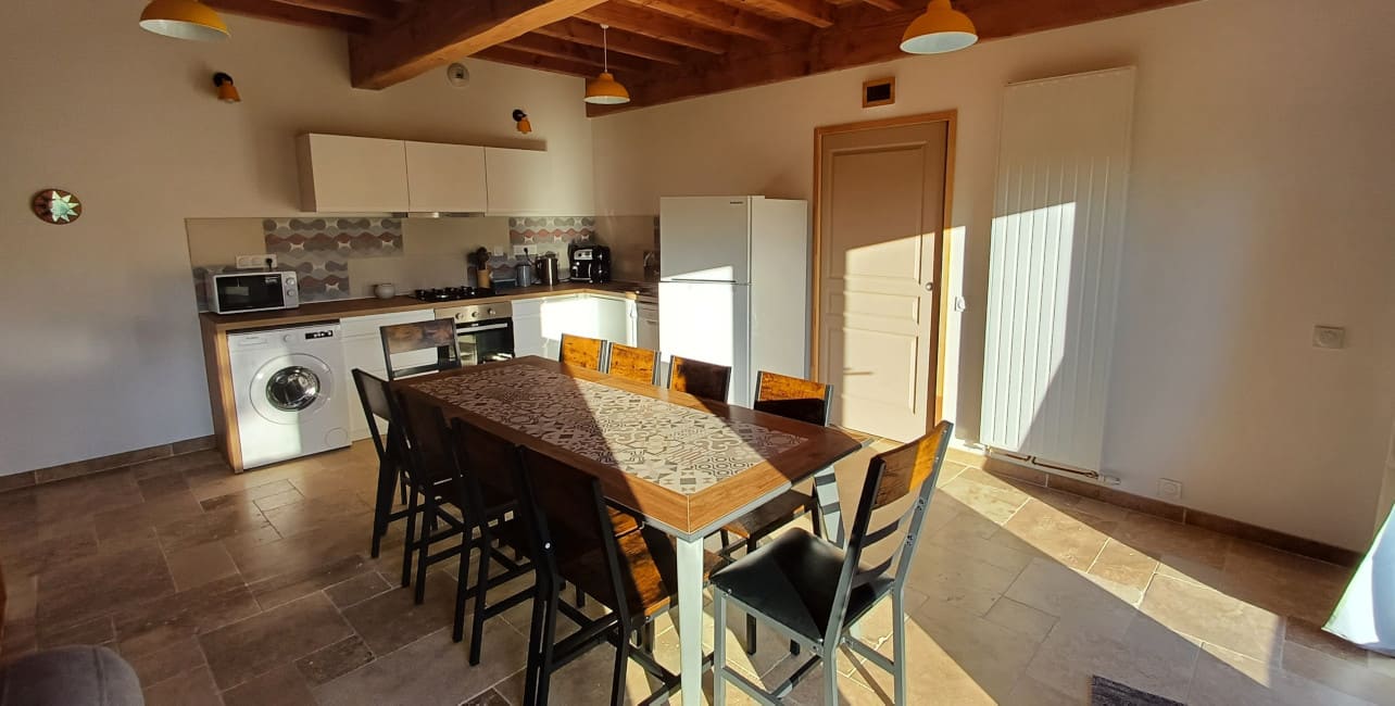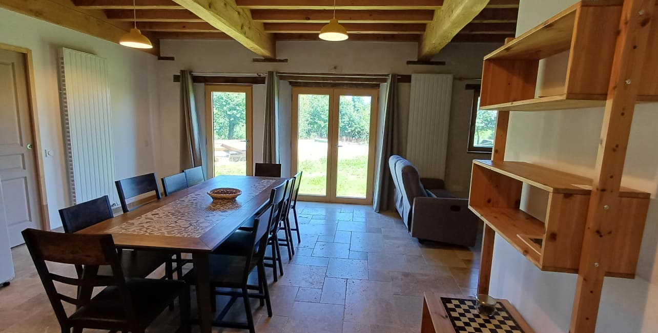 Adjoining our house, the gîte is completely independent. It sleeps 10 to 12 people and is self-catering. You'll find three bedrooms, three bathrooms, a guest toilet, a library, a kitchen, dining area, lounge... as well as a swimming pool, terrace, garden, footpaths...