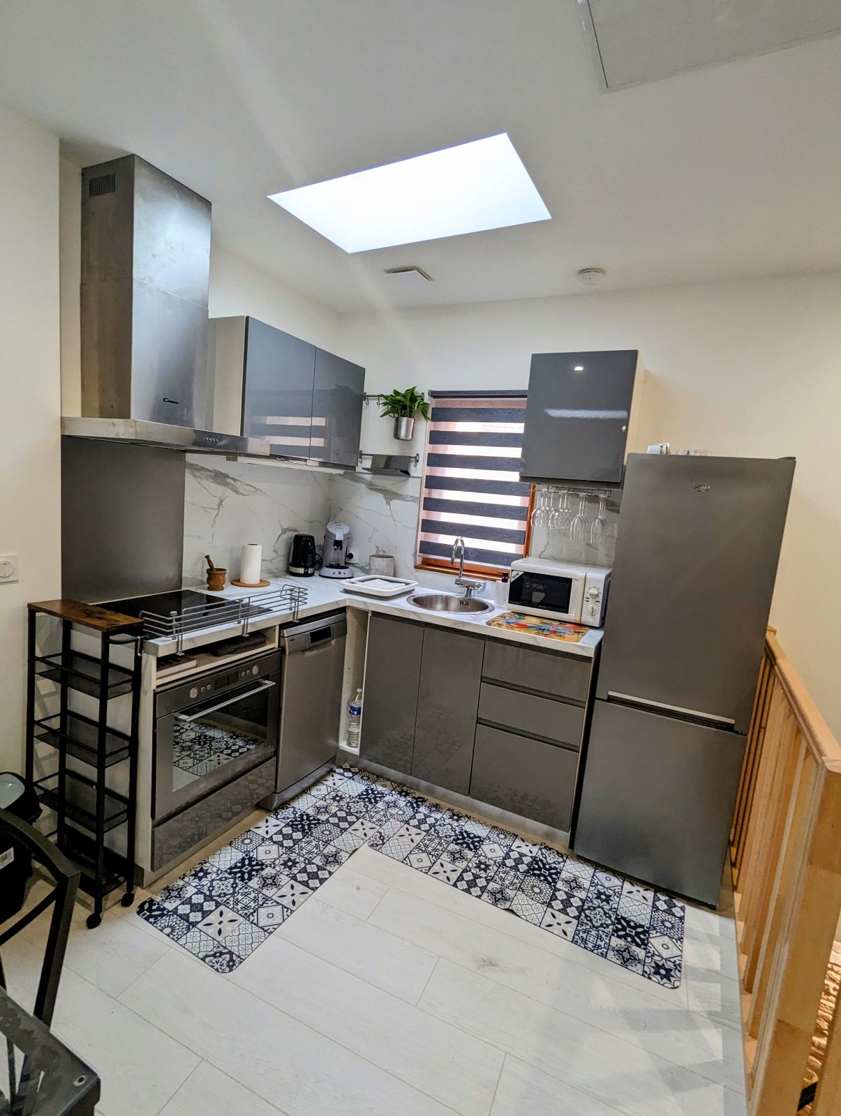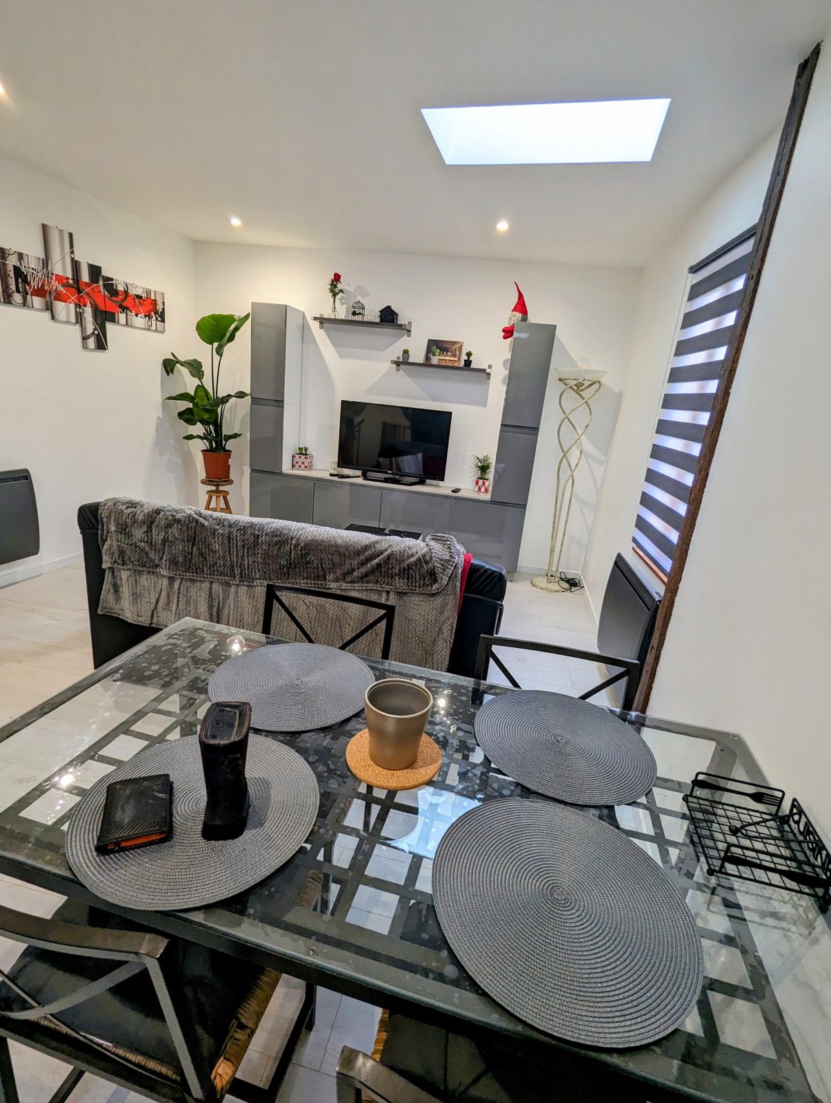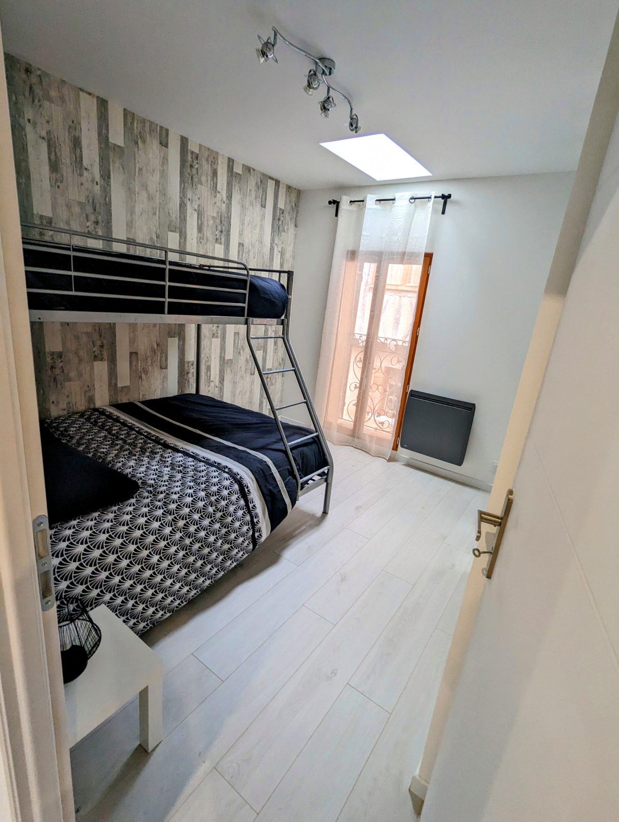 Ground floor: - Garage (for small vehicle) - Separate WC - Bathroom: two washbasins and a shower cubicle. First floor, with laminate flooring - Living room with kitchen / dining table / sitting room - bedroom with double bed - a bedroom with a single bed, bunk beds and a double bed