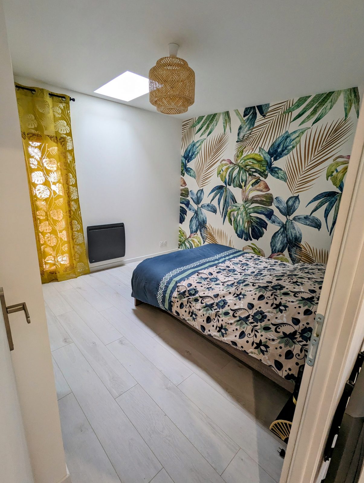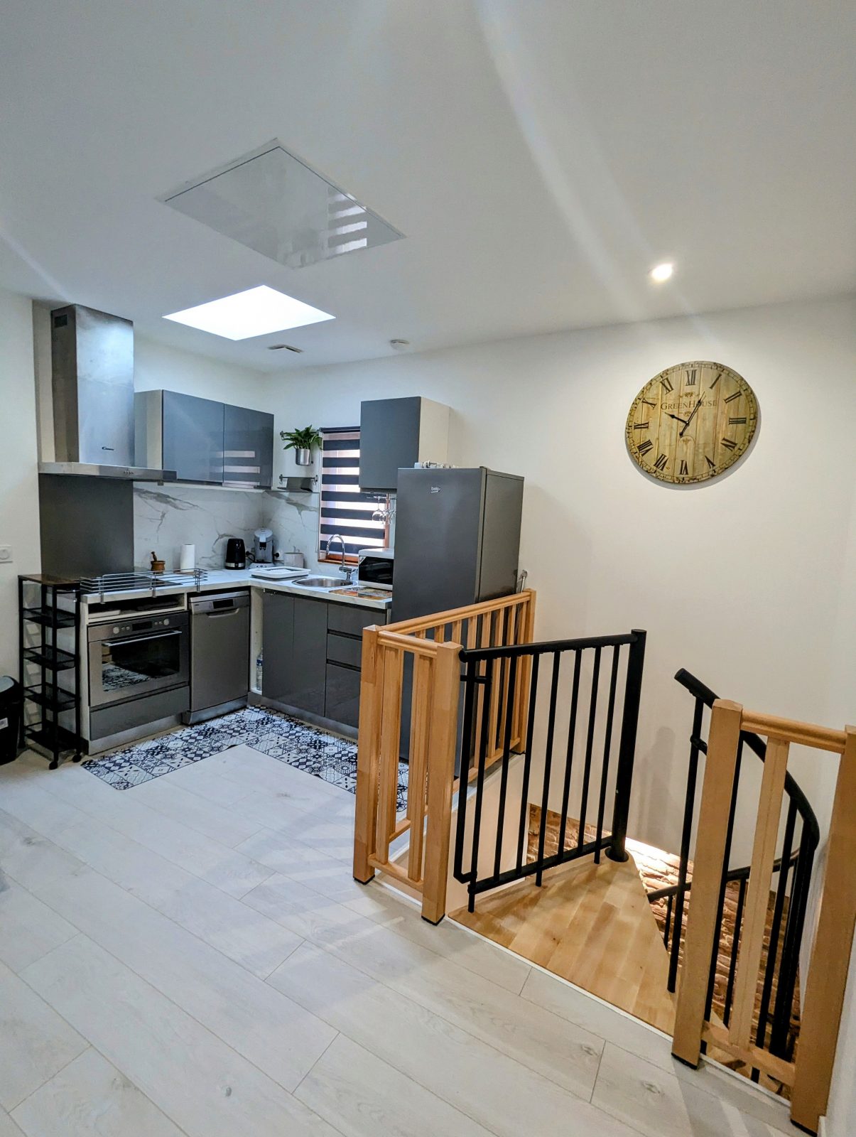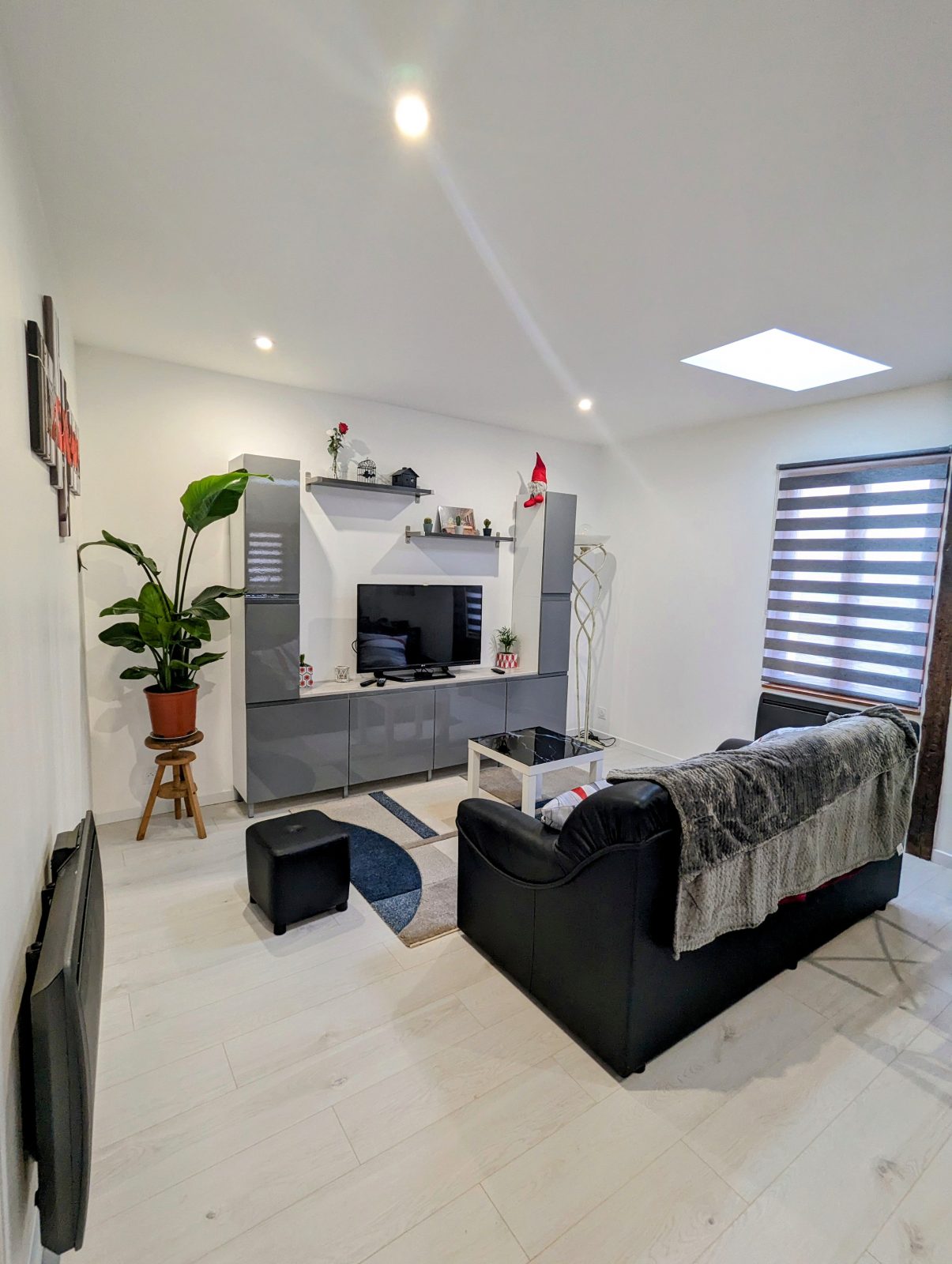 Ground floor: - Garage (for small vehicle) - Separate WC - Bathroom: two washbasins and a shower cubicle. First floor, with laminate flooring - Living room with kitchen / dining table / sitting room - bedroom with double bed - a bedroom with a single bed, bunk beds and a double bed