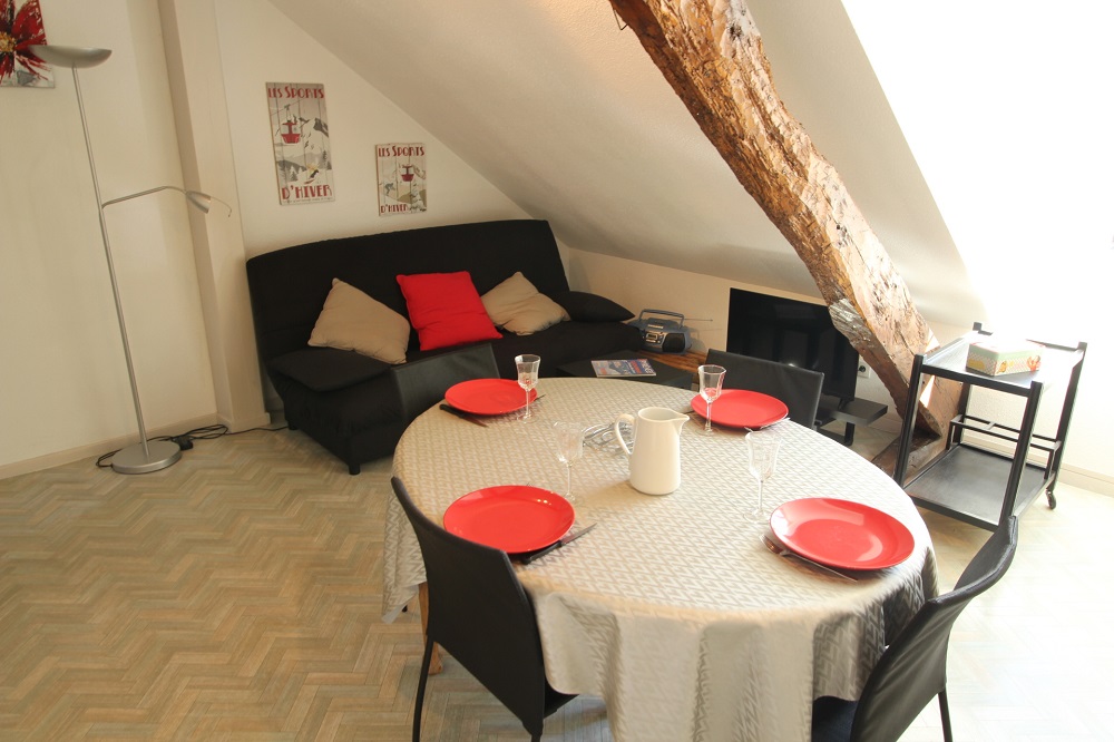This flat comprises an entrance hall with large cupboards, a separate WC, a bathroom with bath, a south-facing living room with sofa, table and chairs and television. A fully-equipped kitchenette (dishwasher, microwave, mini-oven, fridge, induction hob, kettle, coffee maker, toaster). Two attic bedrooms, one with a double bed (140cm) and the other with 2 single beds (80cm). Private parking. Shared cellar. The floor is covered with linoleum, except in the carpeted rooms. Pets not allowed.