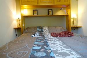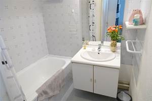 Quietly located at the rear of the building, this flat comprises a living room with a 2-person sofa bed, solid wood furniture, television, kitchenette with induction hob, oven and microwave, and washing machine. The west-facing living room has a balcony and garden table, and a lovely view of the mountains. One bedroom with a double bed (140cm) facing west, bathroom and separate WC. Floating parquet flooring. Shared cellar. Private car park no. 85. Pets allowed.