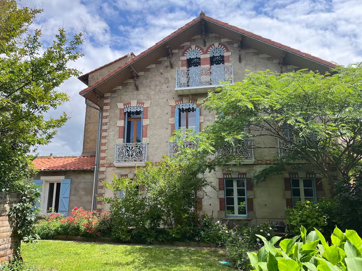 Reservations via booking platform. Large, charming house in the centre of the village, quiet location with garden not overlooked, west-facing. Cool (thick walls) in summer. The kitchen opens onto the terrace, the arbour and the garden. 2 bathrooms, 1 study, 1 lounge, 1 utility room and 3 large bedrooms. Bike shed. Shops within walking distance. View of the Pyrenees from the 2nd floor.