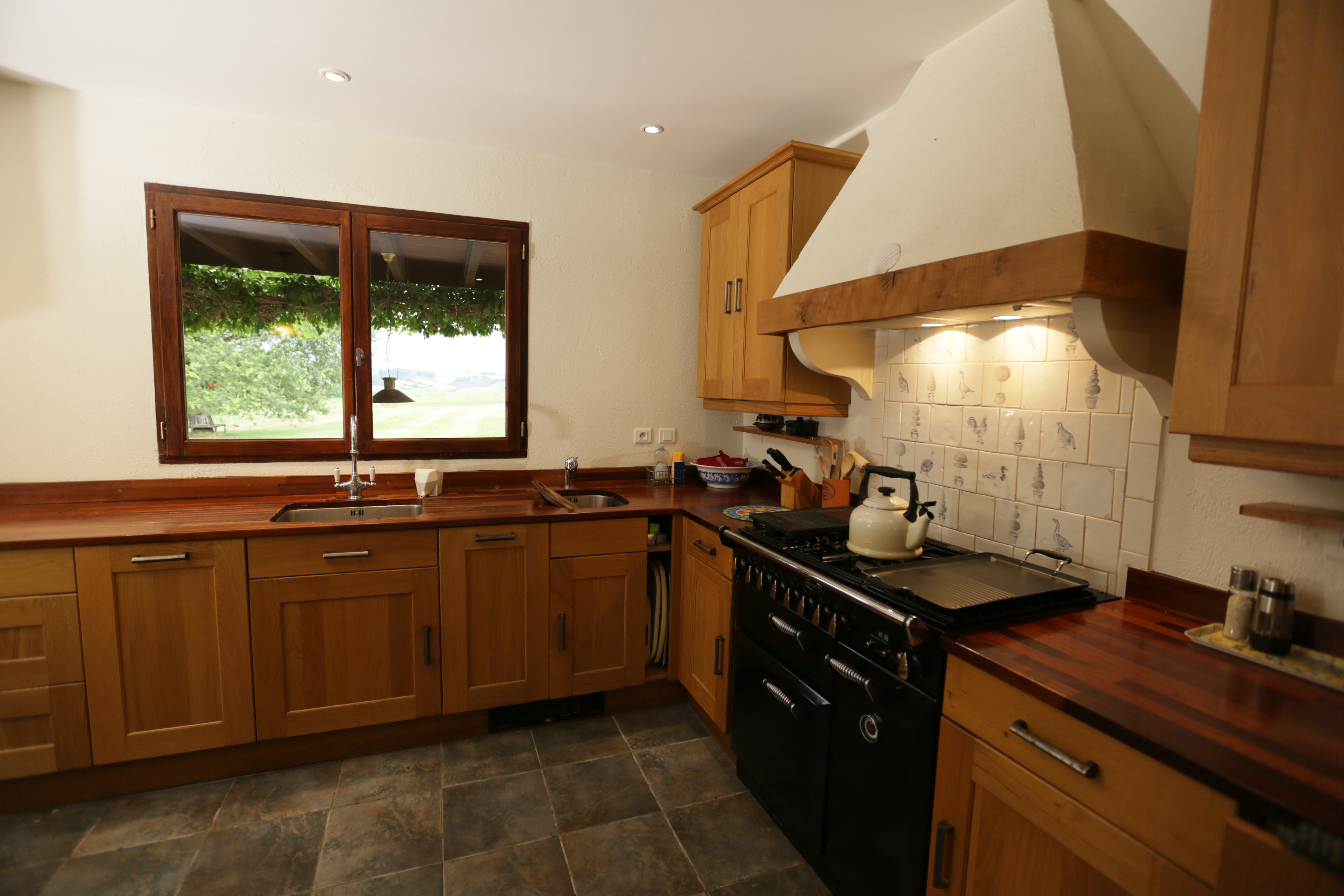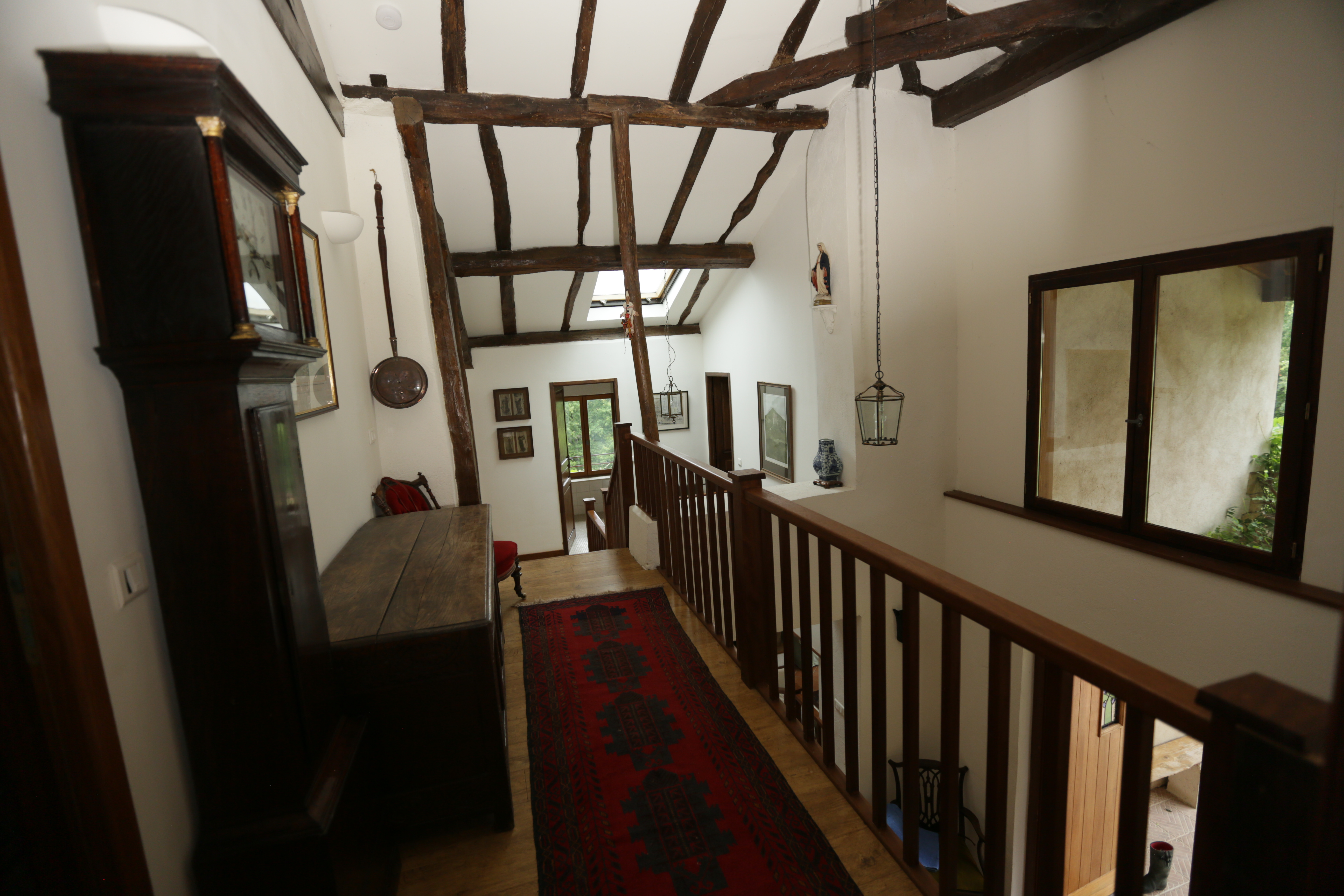 The property, set in 8 hectares of fields and woodland down to a stream, overlooks the surrounding hills and mountains. The converted barn has five bedrooms: two king-size suites with en-suite shower rooms, a double bedroom and a double bunk room and a single bedroom. There is an additional family bathroom on the first floor and a shower room on the ground floor. On the ground floor, there is a generous lounge equipped with a wood-burning stove, sofas and dining area. The kitchen is well equipped and also has a table and seating for 10. There is plenty of seating and space for outside dining and a terrace perfect for large meals and barbecues. Beautiful private swimming pool. Large front lawn area with trampoline (not equipped with safety net) and extensive woodland. Travellers have full and exclusive use of the barn, garden, pool and woodland facilities. Please note: The additional buildings, garages and main farmhouse being restored are private. The barn has open staircases and a low balustrade. There is a pond at the entrance to the property.