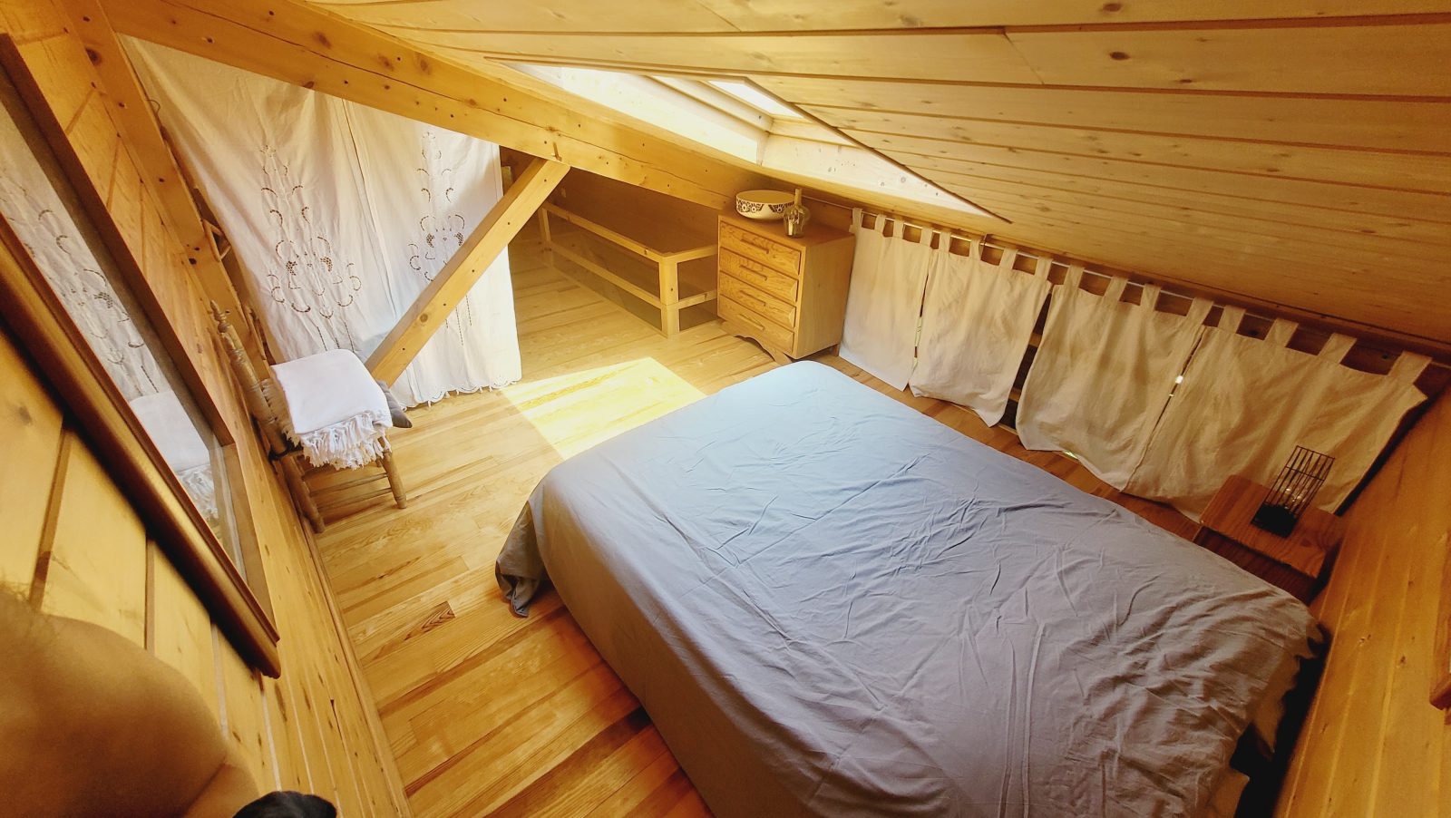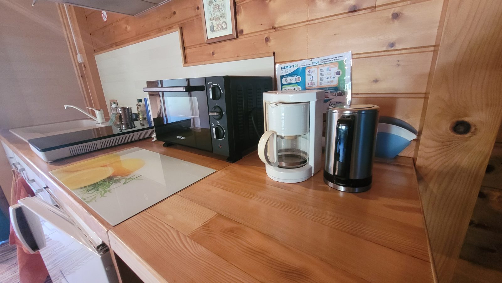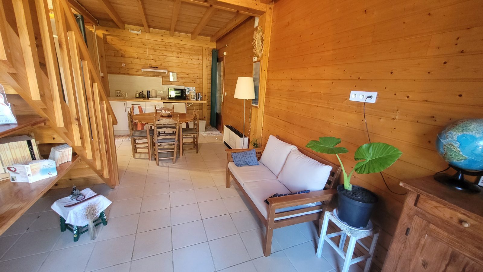 The accommodation is in a quiet location, in an all-wood interior and exterior style. It has a 35m2 room with kitchen, shower and toilet. On the mezzanine level, via the staircase, there are 2 separate sleeping areas with a double bed (140cm) and a single bed (90cm). The maximum height is 1.8m. Outside is a garden with a table where you can eat. In the courtyard, you can park your car opposite the front door. Your car will be parked in our enclosed courtyard. Bicycle reception We warmly welcome cyclists and mountain bikers. There is a secure garage where you can park your bikes in peace and quiet. You'll also find a repair kit and an outdoor washing point.