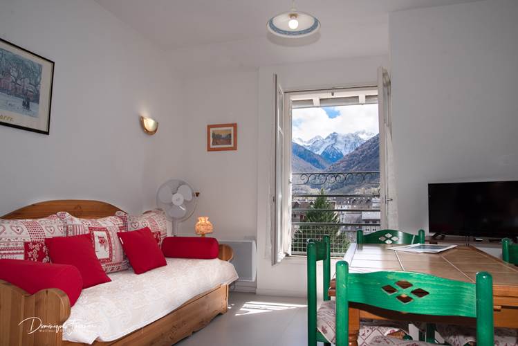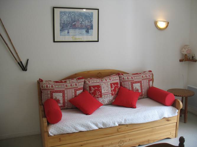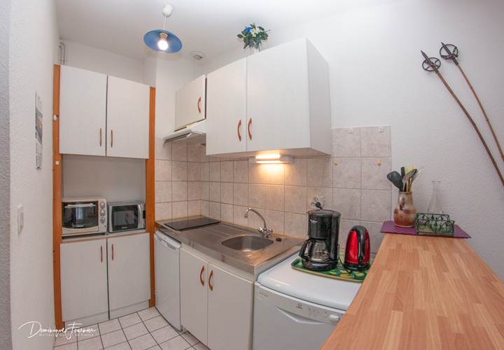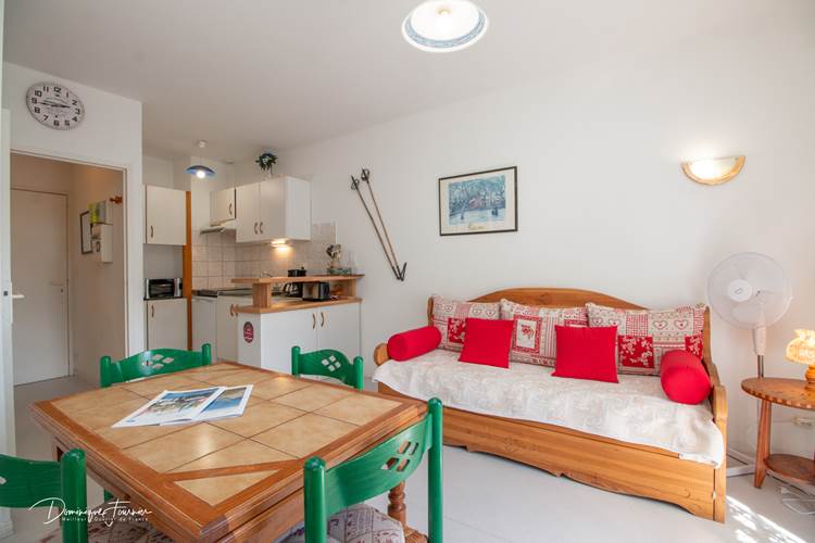 T2 flat, 36m2, 4th floor, shared grounds. Living room with kitchenette and sofa bed (2 x 80cm or 1 x 160cm). Bedroom (1x140). Shower room, separate WC. DVD player, washing machine, dishwasher, microwave, freezer. Bike and ski storage.