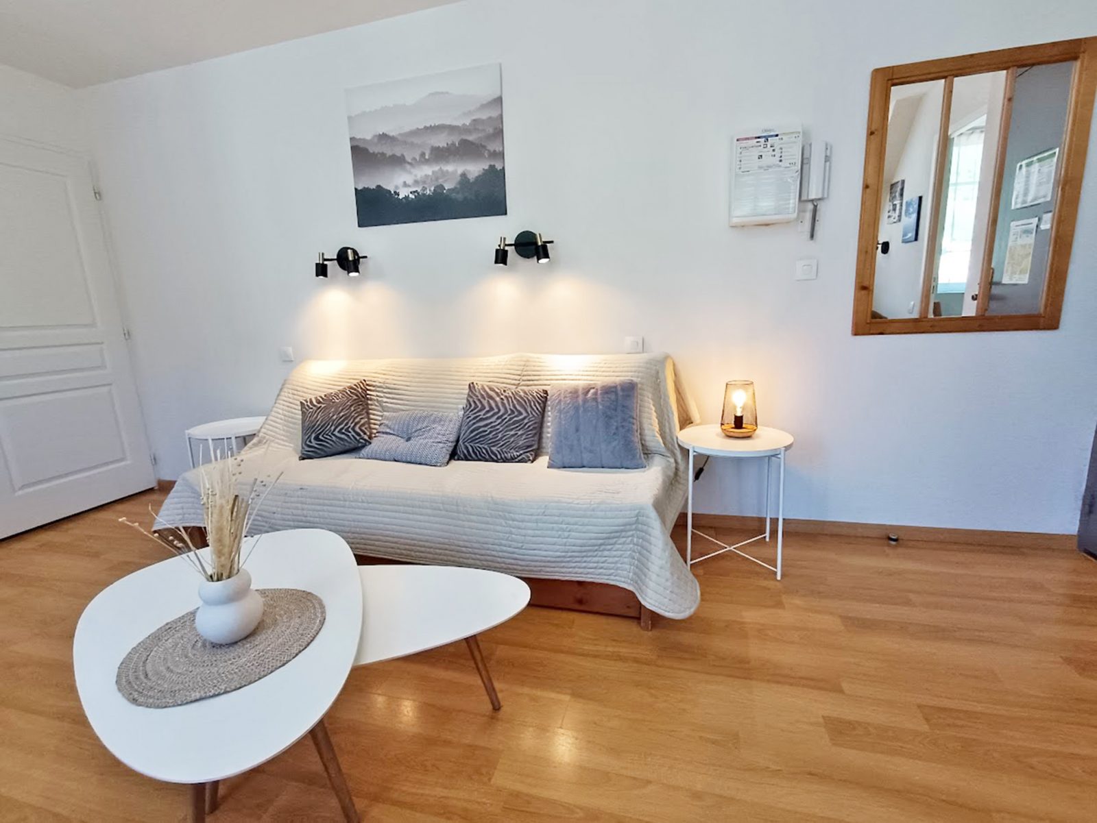 The living room has a pull-out sofa bed (140x190cm) and a single BZ sofa (90x190), a table and five seats, two coffee tables and a flat-screen TV. The kitchen area is equipped with an oven, microwave, fridge with freezer, induction hob, extractor fan, kettle, filter coffee maker, toaster, pressure cooker, dishwasher and all the crockery and cutlery you need. The bedroom has a double bed (140x190cm) and a sliding wardrobe, individual wall lights and a bedside table on either side of the bed. The bathroom has a bath, vanity unit, heated towel rail and hairdryer. Our kitchen stock is at your disposal (coffee, tea, oil, vinegar, salt, coarse salt, pepper...) as well as household products. You can use them as you wish. We thank you in advance for renewing what you have finished during your stay. Non-smoking accommodation. Towels, bed linen and household linen are available from the concierge at an additional cost. End-of-stay cleaning available from the concierge service at an additional cost.