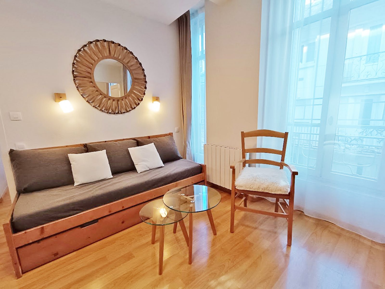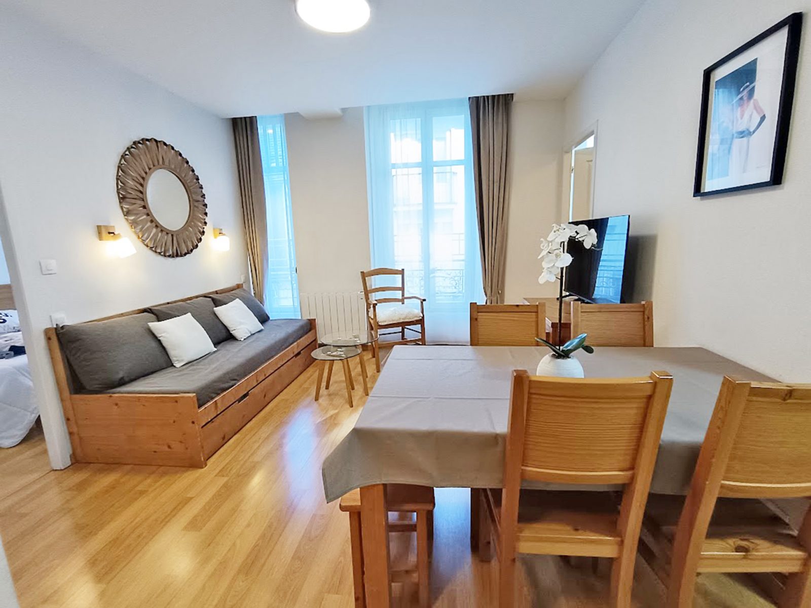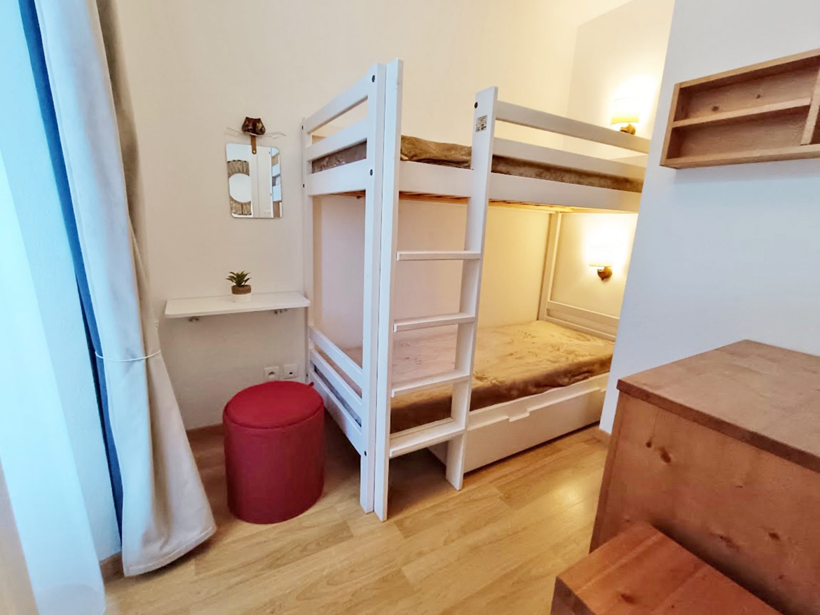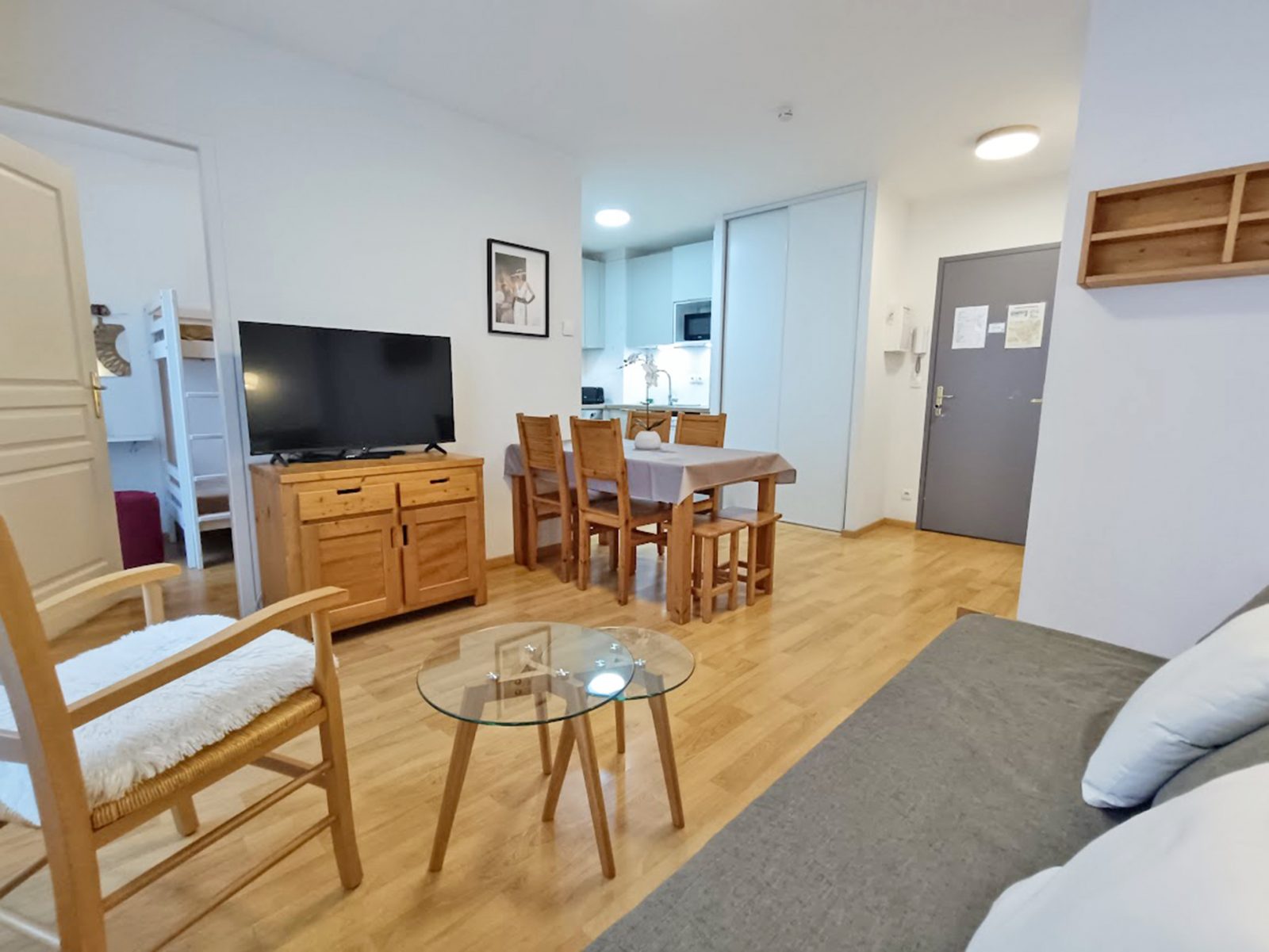 The living room has a pull-out sofa bed (140x190cm), a table with six seats, two coffee tables and a flat-screen TV. The kitchen area is equipped with an oven, microwave, fridge with freezer, four-burner induction hob, extractor fan, kettle, filter coffee maker, toaster, food processor, pressure cooker, dishwasher and all necessary crockery and cutlery. The master bedroom has a double bed (140x190cm) and a sliding wardrobe, individual wall lights and a bedside table on either side of the bed. The second bedroom has a bunk bed and chest of drawers. The bathroom has a bath, vanity unit, towel rail and hairdryer. There is a separate WC. Our kitchen stock is at your disposal (coffee, tea, oil, vinegar, salt, coarse salt, pepper...) as well as household products. You can use them as you wish. We thank you in advance for renewing what you have finished during your stay. Non-smoking accommodation. Towels, bed linen and household linen are available from the concierge at an additional cost. Cleaning at the end of your stay available from the concierge service at an additional cost.