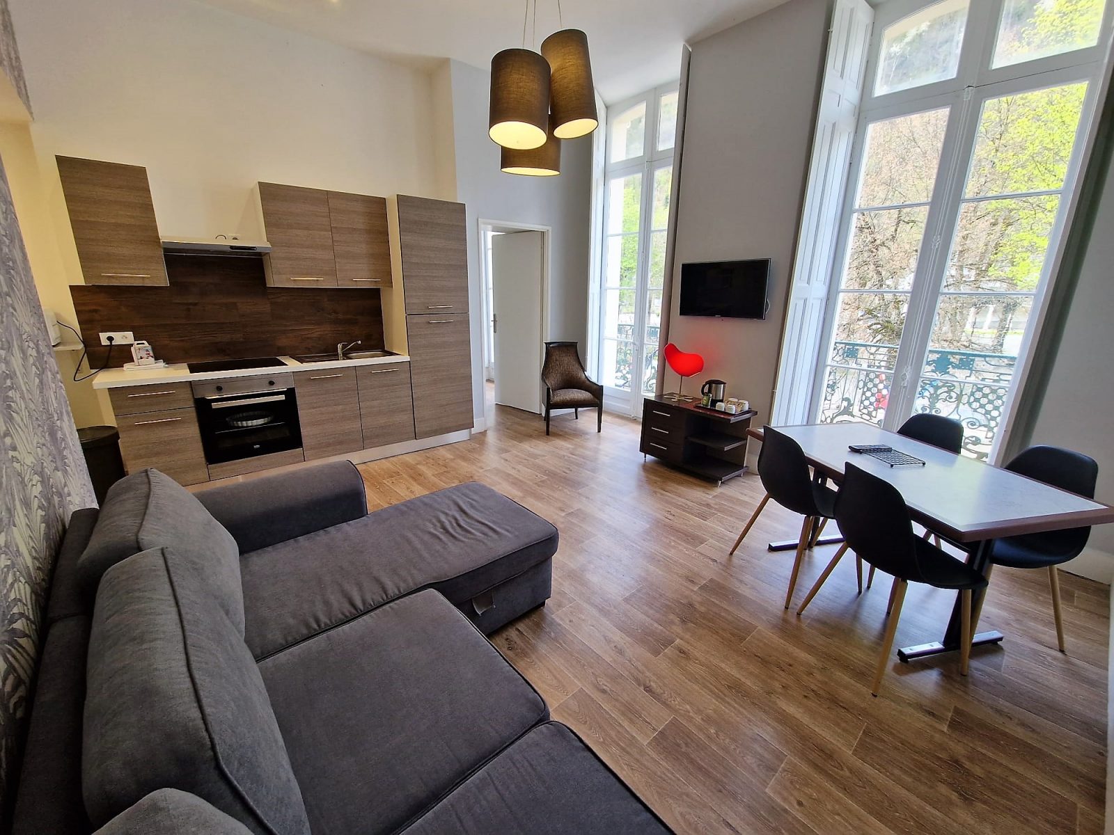 At the foot of the Pyrenees, a stone's throw from the town centre and the cable car - all comforts and a warm welcome. Close to shops and restaurants. Bed linen, towels and end-of-stay cleaning included. This fully-equipped one-bedroom apartment has a spacious living room with high ceilings, a bedroom with a double bed and comfortable new bedding, a sofa bed, a well-equipped kitchen with a 4-burner ceramic hob, an electric oven, a fridge-freezer, a coffee machine with permanent filter, a microwave oven, plenty of crockery and cooking utensils, a dressing room, a flat-screen TV, a bathroom with shower, a vanity unit with mirror and a hairdryer. Lift and code access. Hoover, iron and ironing board on request, Professional washing machine and tumble dryer in the basement. Free secure bike room. Free access to sports facilities. High chair and cot available on request and subject to availability. Continental breakfast available in a room on the ground floor (reservation required).