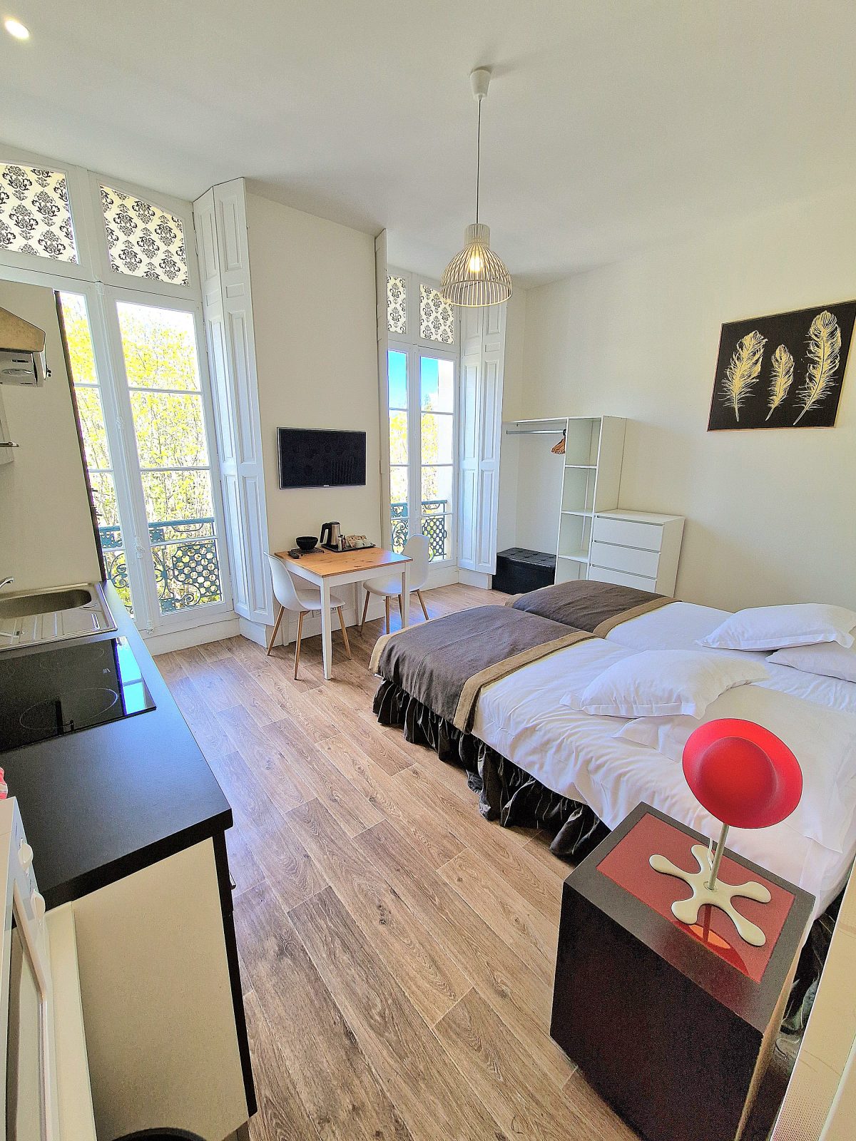 At the foot of the Pyrenees, a stone's throw from the town centre and the cable car - all comforts and a warm welcome. Close to shops and restaurants. Bed linen, towels and end-of-stay cleaning included. This fully-equipped studio offers a spacious living room with high ceilings, 2 90cm beds with comfortable new bedding, a well-equipped kitchen with a 4-burner ceramic hob, electric oven, fridge-freezer, electric coffee maker with permanent filter, microwave oven, plenty of crockery and cooking utensils, dressing room, chest of drawers, flat-screen TV, bathroom with shower, vanity unit with mirror, hairdryer. Lift, digicode. Hoover, iron and ironing board on request. Professional washing machine and tumble dryer in the basement. Free secure bike room. Free access to sports facilities. High chair and cot available on request and subject to availability. Continental breakfast available in a room on the ground floor (reservation required).