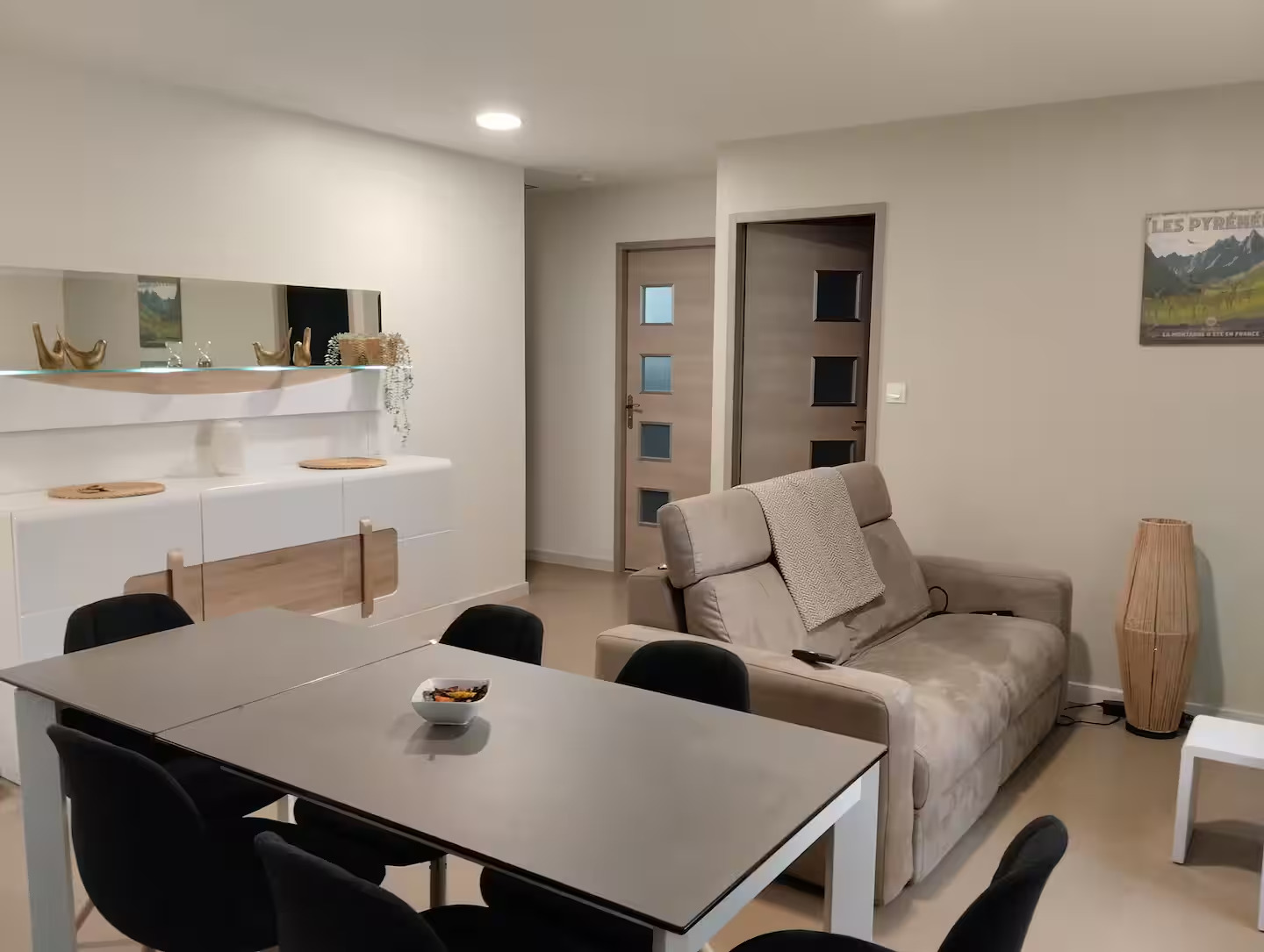 Just a few metres from the River One, our flat offers proximity to Luchon town centre, the tranquillity of a green setting with views of the mountains, and the comfort you need to spend some quality time. Ideal for families, located on the ground floor of the building, your children can play in the park under your supervision. Directly accessible on skis and next to a free shuttle bus service. Free parking in front of the flat, bike garage and cellar available. The flat has 3 bedrooms for 6 people: 2 bedrooms with 160 cm double beds (large wardrobes available) and 1 bedroom with 2 90 cm bunk beds equipped with a second television. The kitchen is fully equipped: fridge-freezer, BEKO stainless steel oven, microwave, hob, dishwasher, toaster, electric kettle, filter coffee maker and Senseo espresso machine. Equipment available: 2 televisions with Ethernet connection, washing machine, hairdryer, iron, clothes hangers, connected radiant heating, smoke detector, cleaning products, board games. For families: baby bath and cot. Arrival from 3pm to 8pm - Departure before 10am. Bed linen and bath towels not provided (can be hired from the concierge service, by prior arrangement). Concierge service available throughout your stay. Pets not allowed.