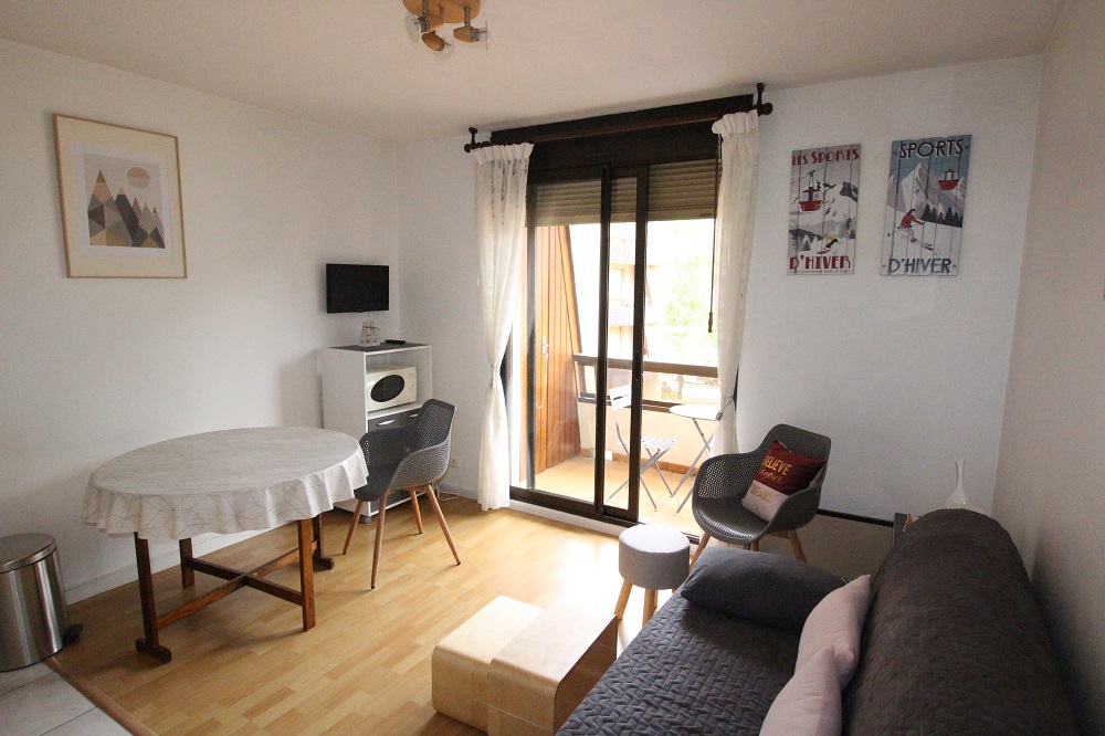 Les Églantiers building, studio cabin for 2/3 people, 21m2, refurbished, located on the 2nd floor with lift, facing north-west with a beautiful view of the mountains and a 4.50m2 loggia with garden table. This flat is close to the shops and the spa.