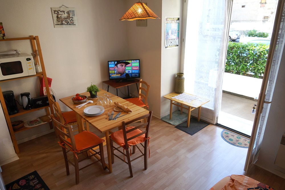 This flat comprises a living room with a fully-equipped kitchenette (kettle, coffee machine, toaster, oven and microwave) and a 2-person sofa bed, wardrobe, television, bathroom with WC. One bedroom with a double bed (140cm) opening onto a south-facing garden and garden furniture. Floating parquet flooring. Private car park n°193. Pets allowed.