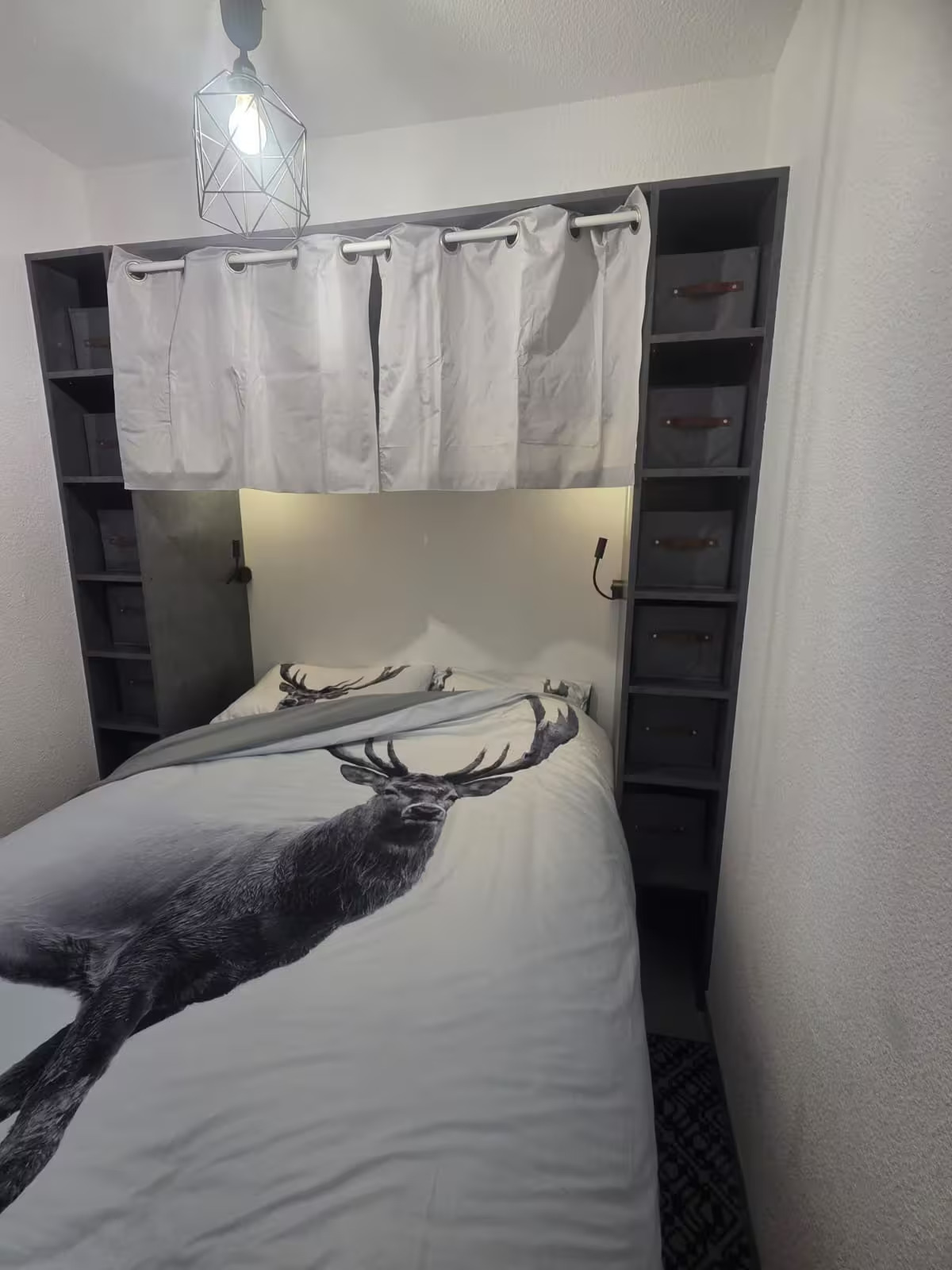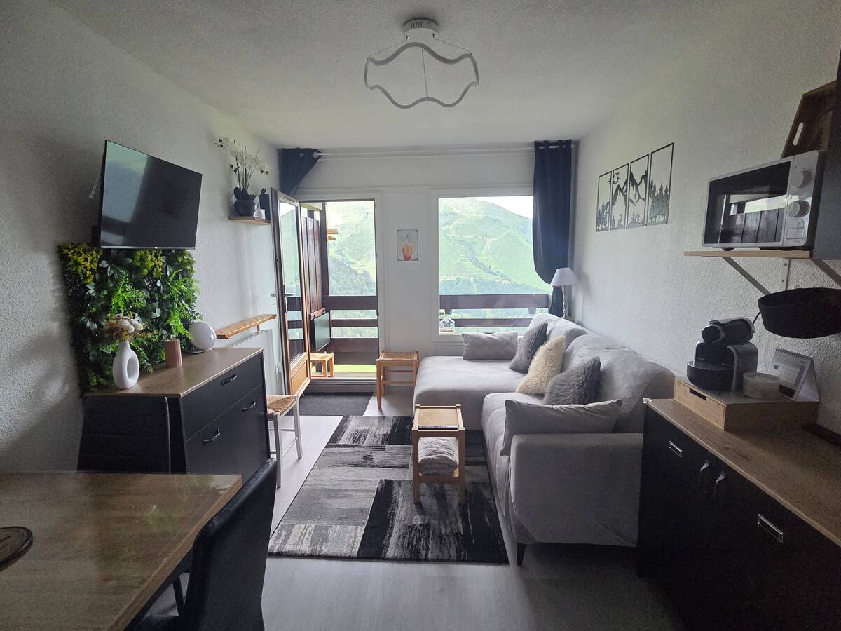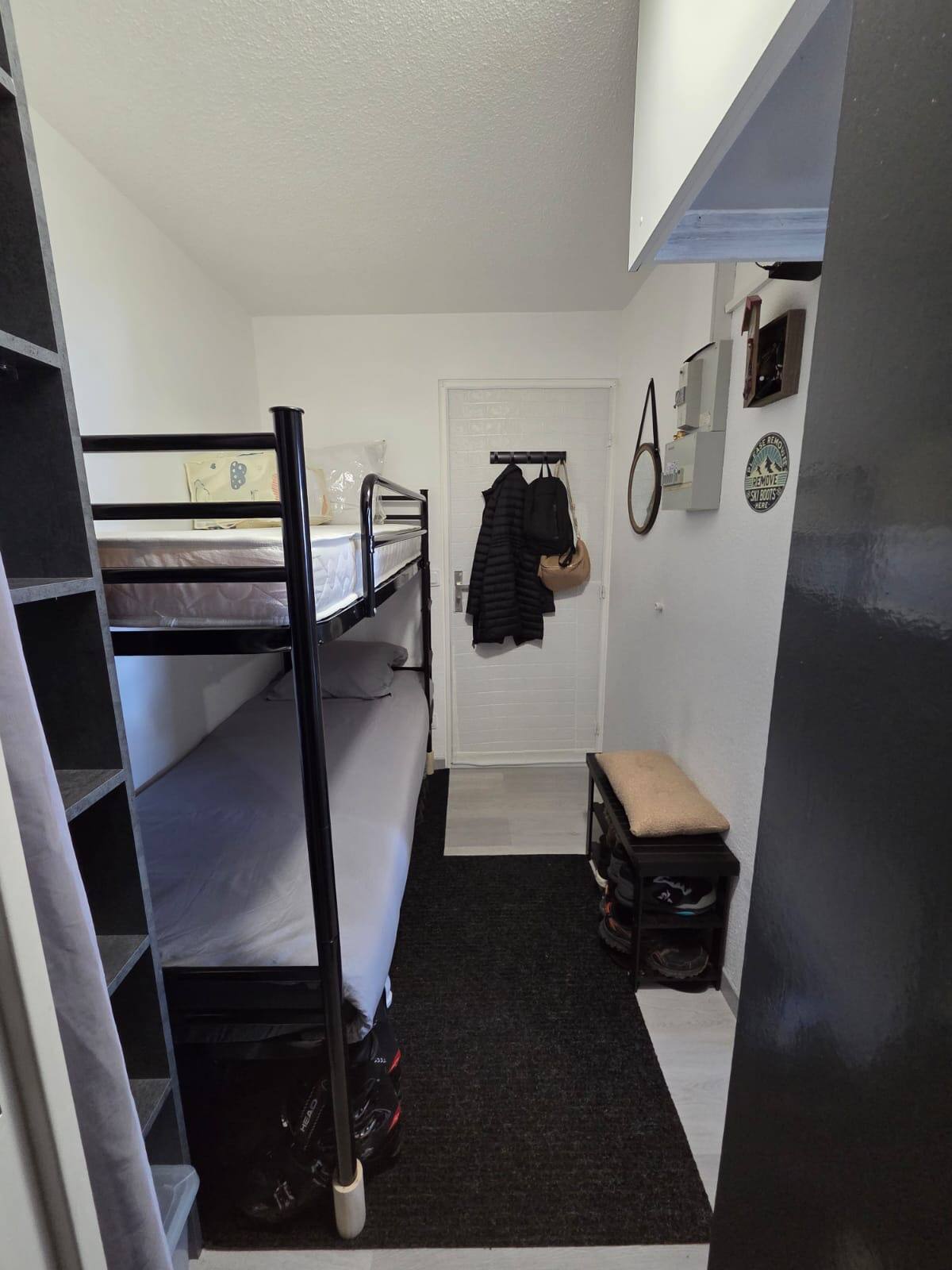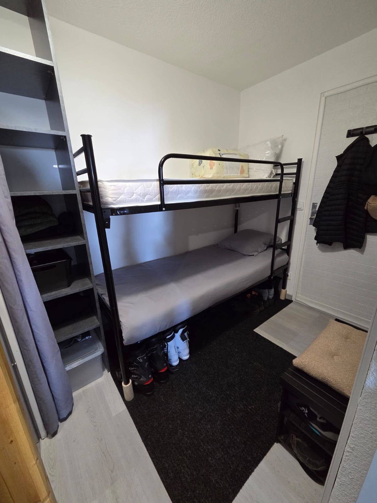 At the foot of the slopes in winter and at the start of hiking trails in summer. Balcony with uninterrupted view of the ski slopes or pastures in summer. Completely new bedding! All paintwork is new. All the equipment is new. New doors and glazing. Good insulation. Very well equipped with lots of storage space! Ski locker at -2, same level as ski departure and return. The accommodation Bedroom with 140x190 bed, plenty of storage space on the sides and above and under the bed with storage bins available. Upstairs storage space for suitcases/bags. Entrance cabin with 2 bunk beds 80x190 (new mattress). Large space for ski boots underneath Column for clothes storage . Living area: 1 sofa with large chaise longue, easily convertible (1 single operation) into a 130x200 bed (new Emma comfort mattress topper + a real bed!!!). A total of 6 pillows, 2 duvets 140x200 bunk beds, 2 duvets 160x200 bedroom beds and sofa. All mattresses have a mattress protector.